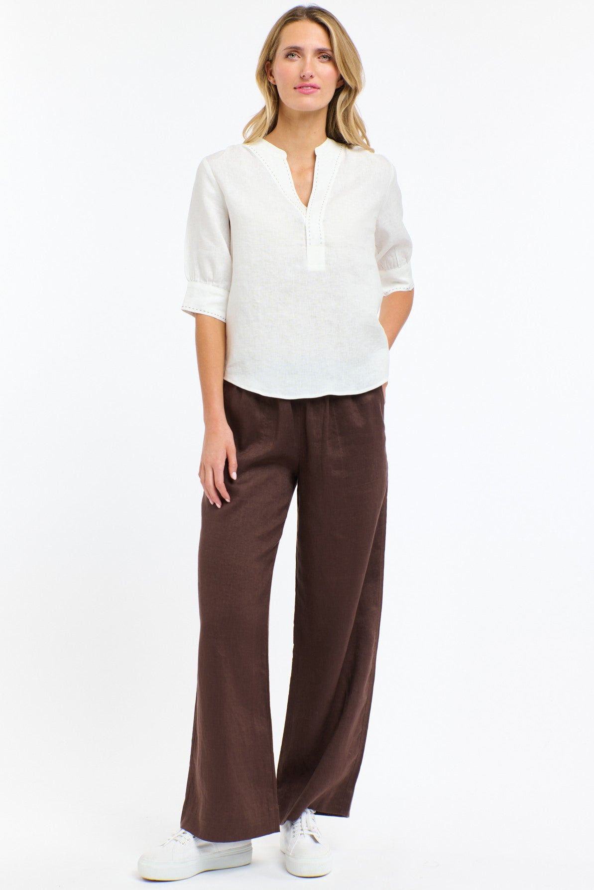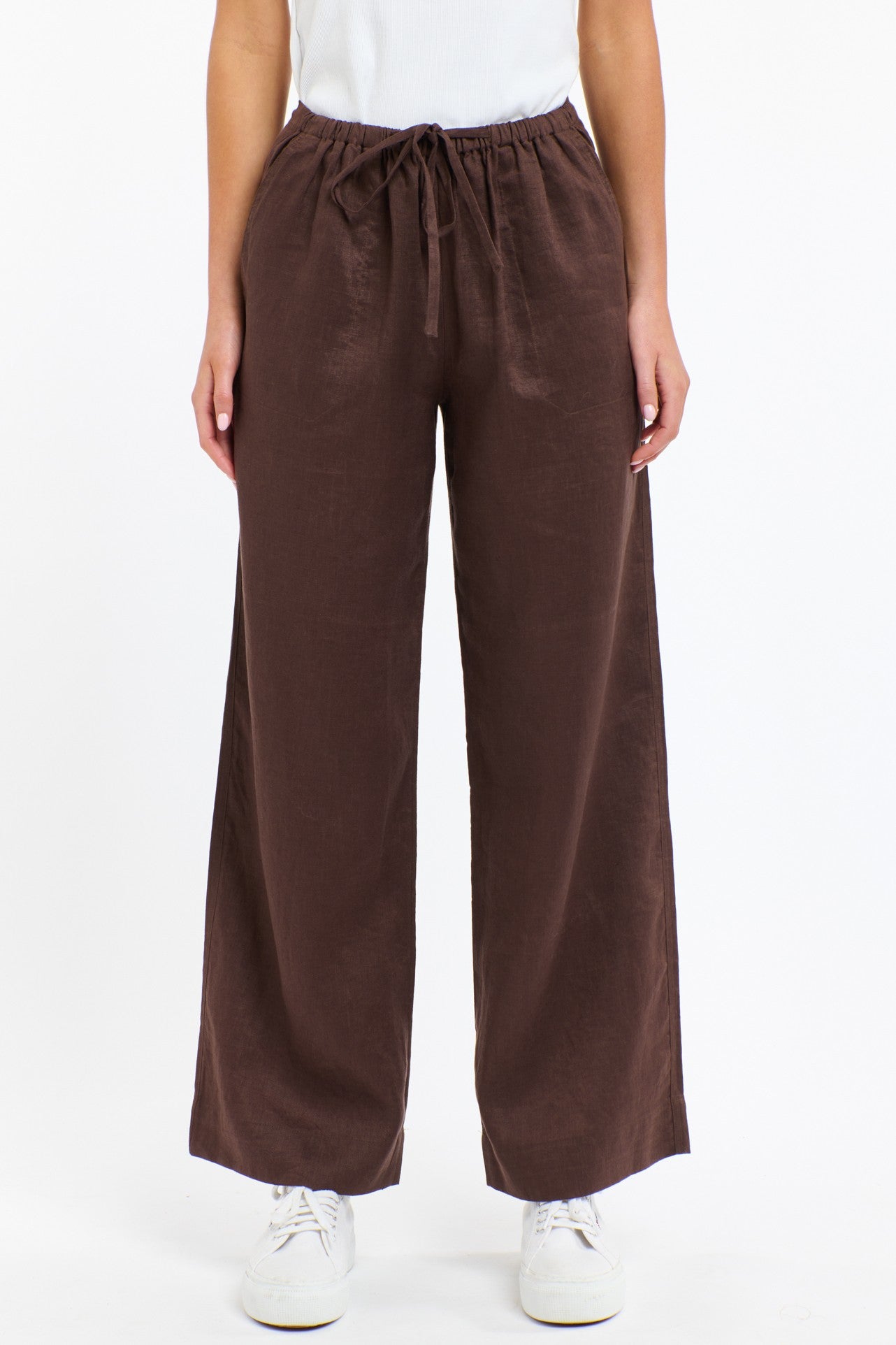 Relaxed, versatile, and effortlessly stylish, the Perry Linen Drawcord Pant is your warm-weather essential. Crafted from breathable pure linen in a rich Chocolate tone, this wide-leg silhouette features a softly elasticated waistband with adjustable drawstring for easy, all-day comfort. Oversized patch pockets add a touch of utility while keeping the look modern and unfussy. Pair with the matching Bradley Stitch Top for an easy set or style with your favourite cotton tank for casual days. A laid-back staple you’ll keep on high rotation.