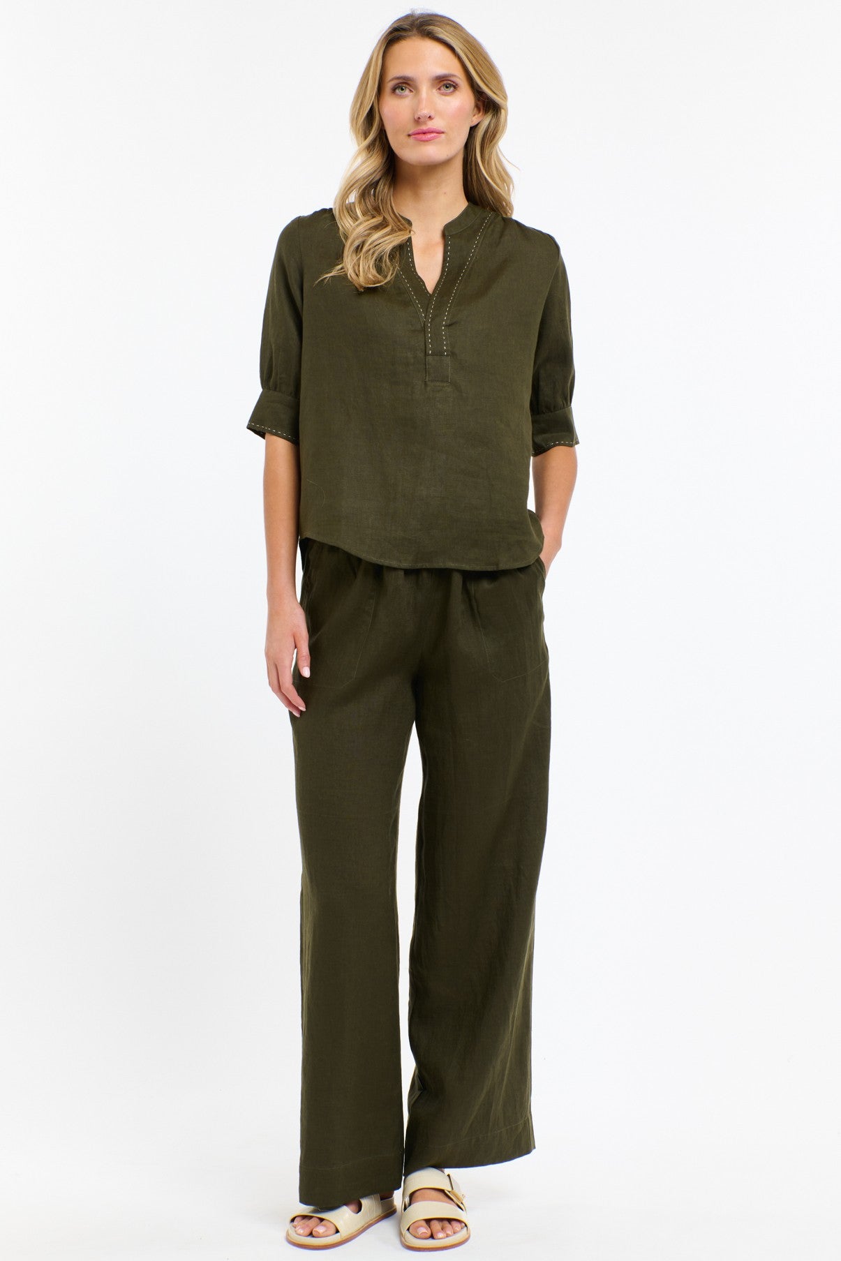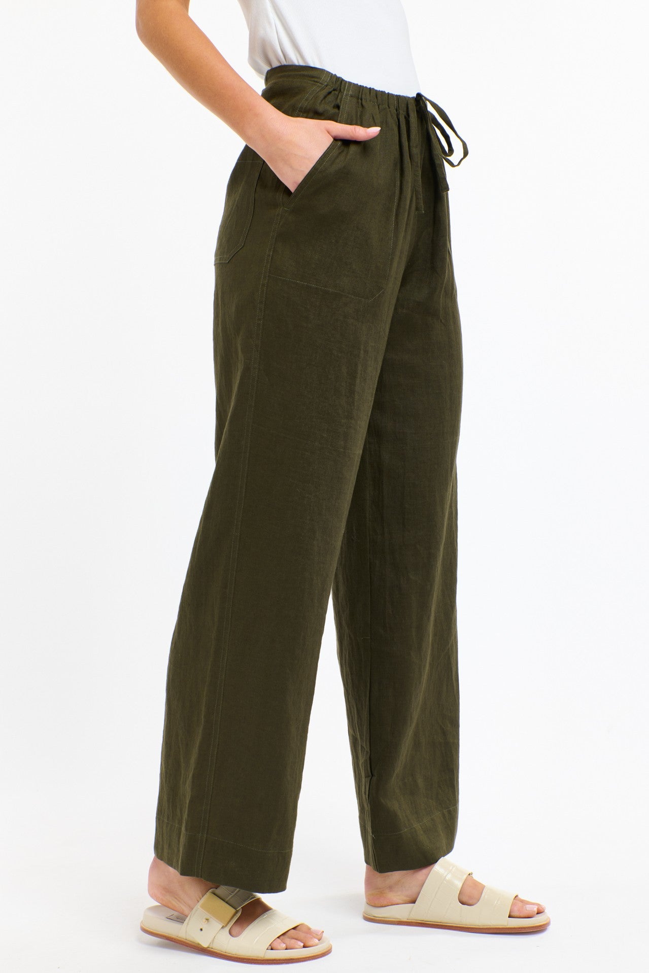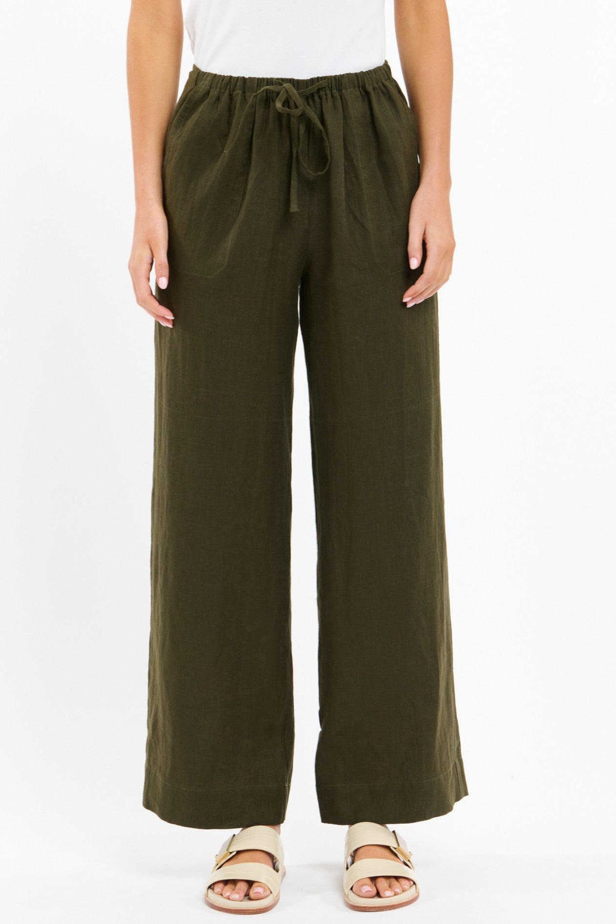 Relaxed, versatile, and effortlessly stylish, the Perry Linen Drawcord Pant is your warm-weather essential. Crafted from breathable pure linen in a rich khaki tone, this wide-leg silhouette features a softly elasticated waistband with adjustable drawstring for easy, all-day comfort. Oversized patch pockets add a touch of utility while keeping the look modern and unfussy. Pair with the matching Bradley Stitch Top for an easy set or style with your favourite cotton tank for casual days. A laid-back staple you’ll keep on high rotation.
