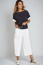 External pockets add character and a slimming effect. This pant calls out for wide soled sneakers or modern flat footwear.