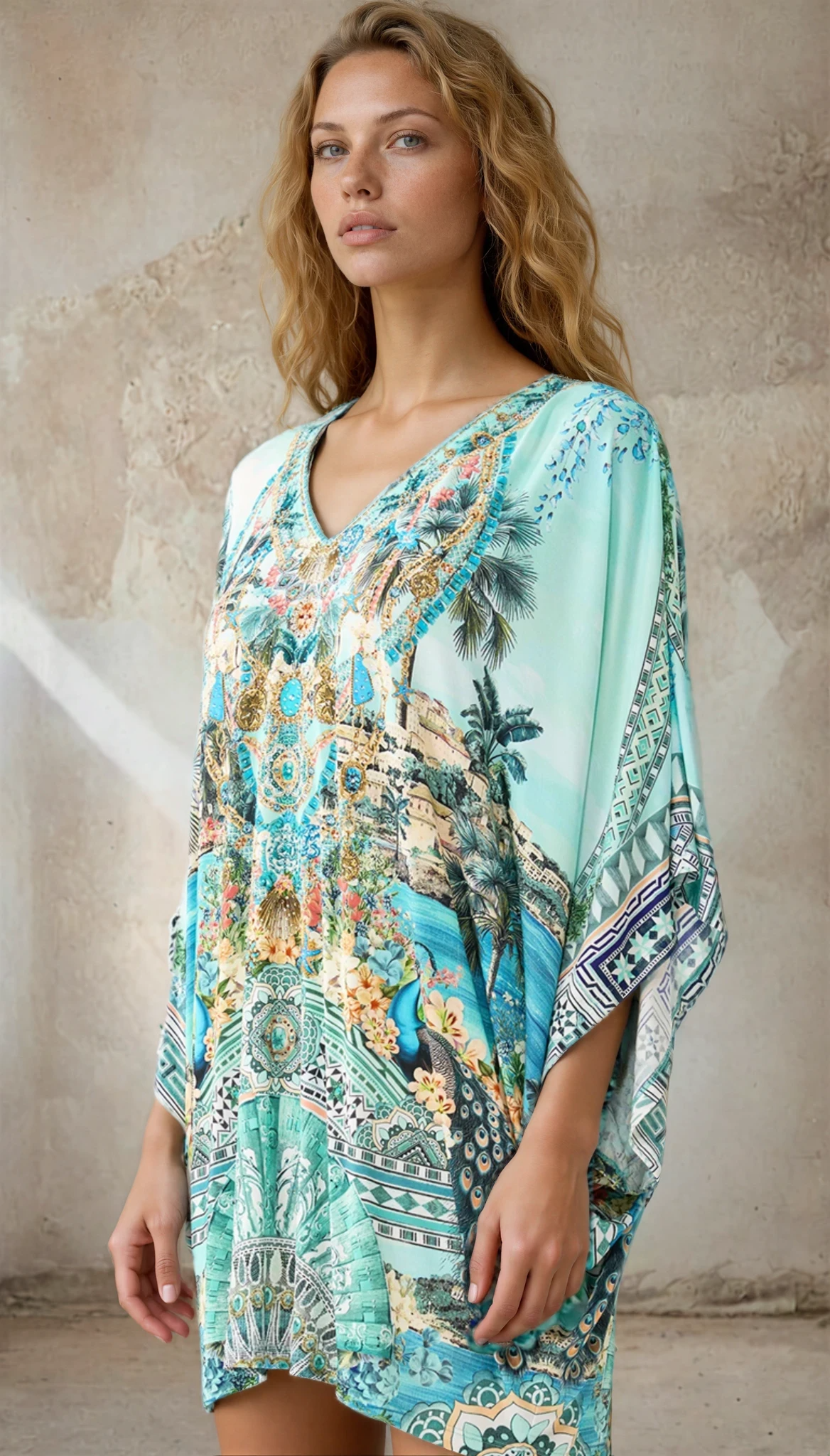 The Balearic Bebé Bat Sleeve Dress is a handcrafted silhouette designed by our in-house artisans. This dress is cut in a relaxed fit to effortlessly drape across the form and features a v-neckline that is framed by 3/4 length sleeves. It's decorated with an all over CAMILLA print and intricately placed crystal embellishments for luminous detail.