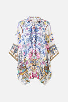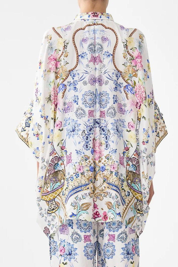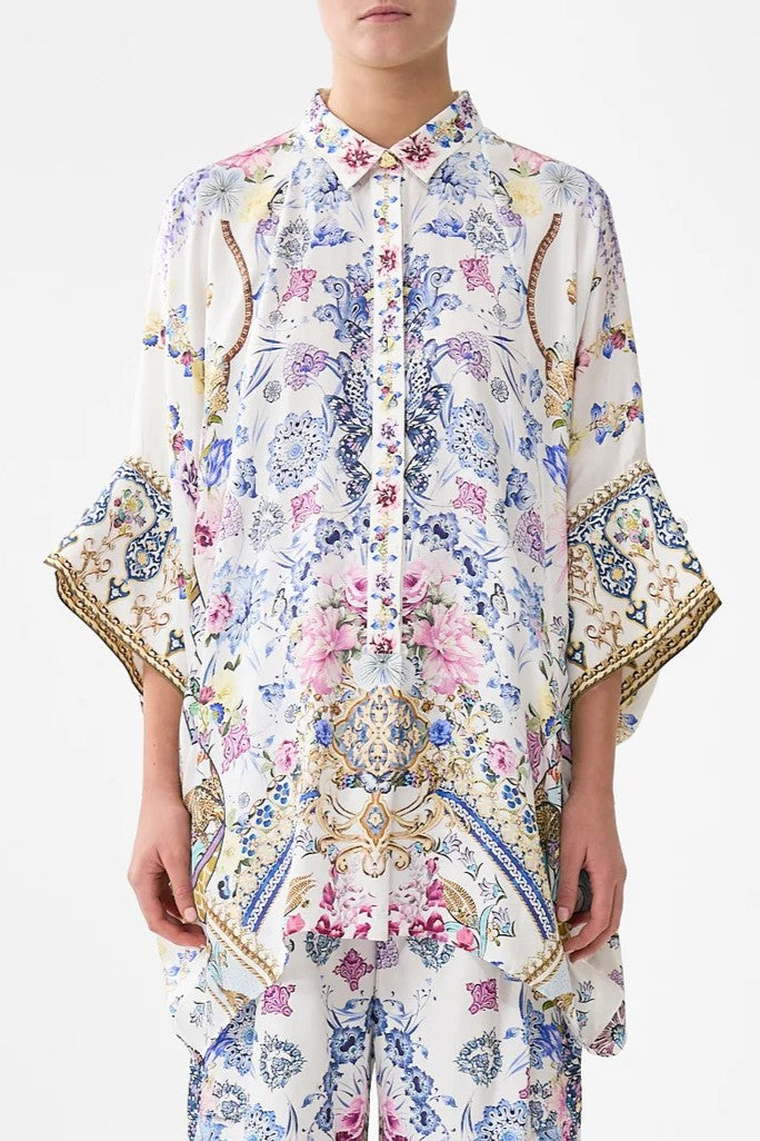 The All About That Lace Batwing Shirt is a handcrafted silk silhouette designed by our in house artisans. Reimagined in an exclusive limited edition print, this batwing shirt features raglan sleeves framed by a collared neckline. Adorned with buttoned cuffs, it's finished with crystal embellishment for luminous detail.