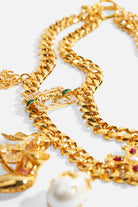 The Queen Of Charms Statement Necklace is a handcrafted accessory designed by our in-house artisans. The joyful spirit of the charm bracelet is reimagined in a bold, double-strand necklace adorned with a procession of Spanish-inspired emblems. Created in solid brass, this custom-designed piece is finished in 18K gold plating for a luminous, high impact finish.