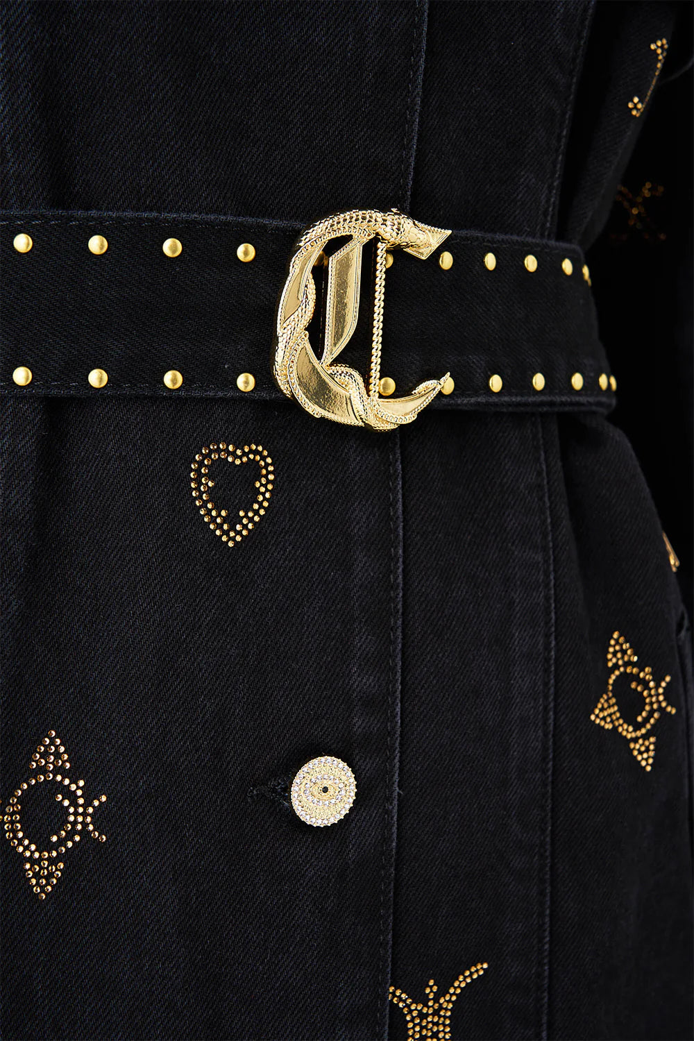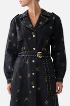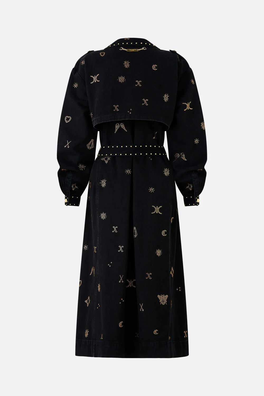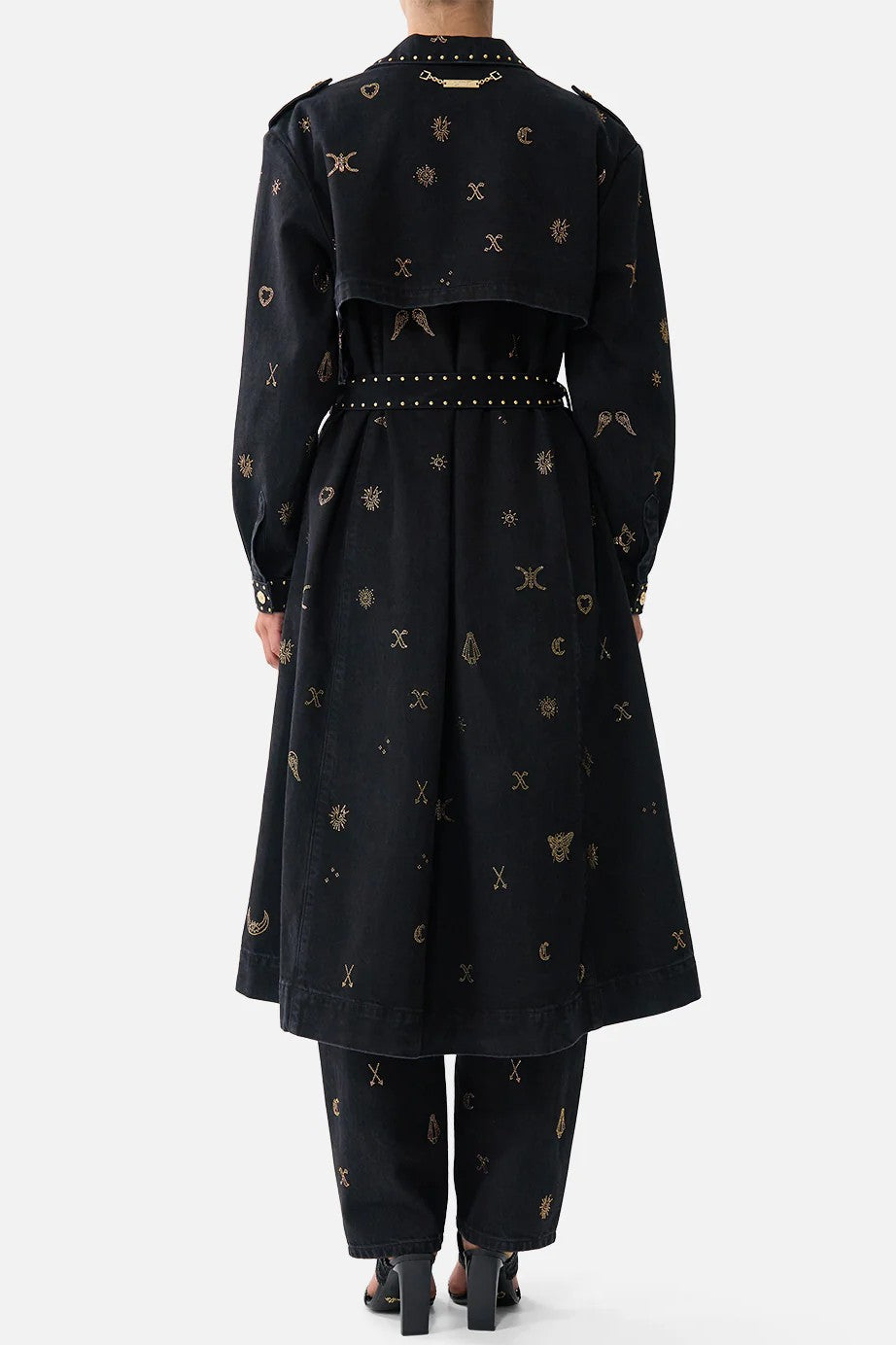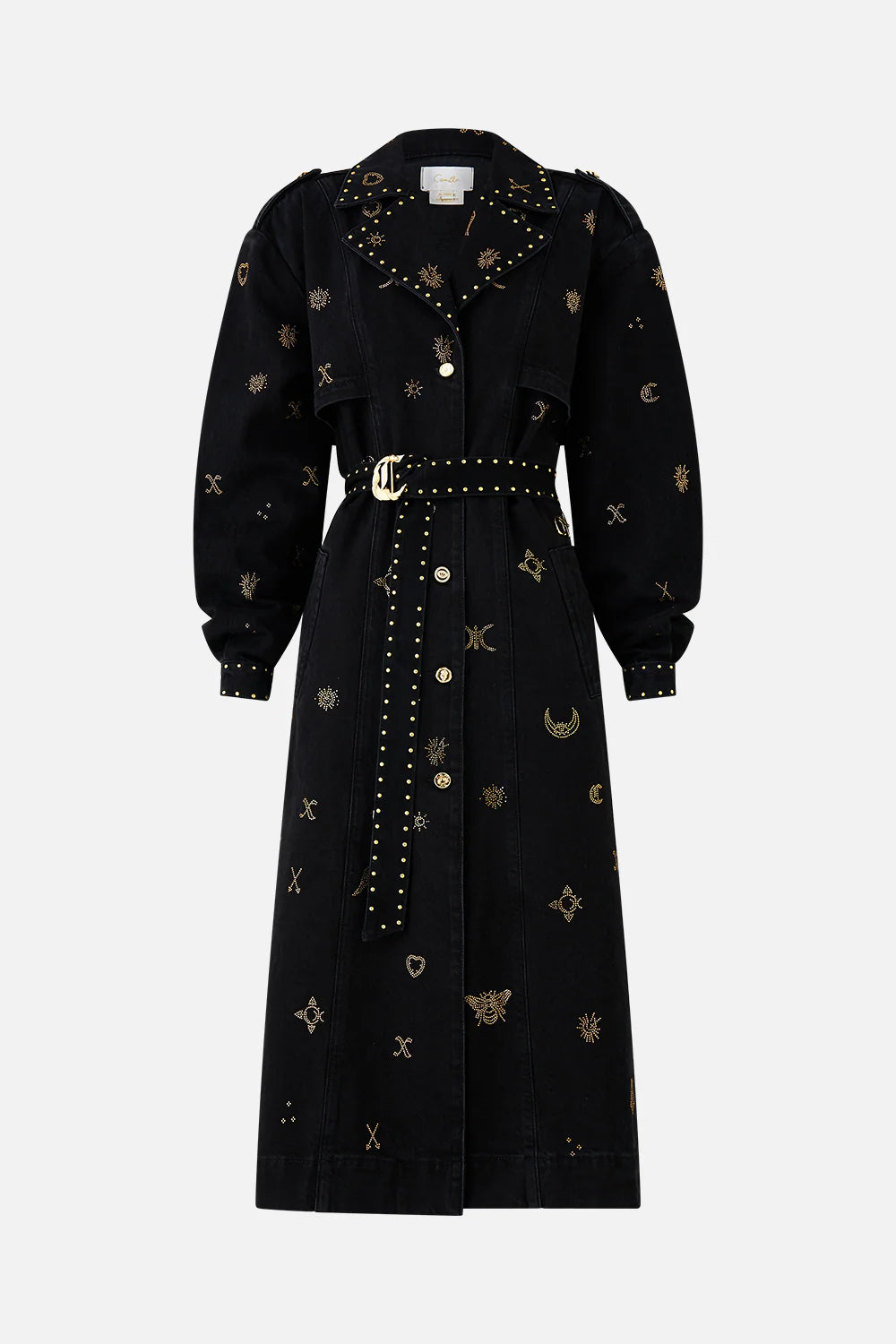 The Heirloom Empire Longline Belted Trench Coat Denim is designed by the Camilla in house artisans and masterfully cut by our manufacturer in Istanbul. A wardrobe staple reimagined, this longline trench coat is crafted from flexible denim with a button front opening for effortless wear. It features front pocket welts, custom camilla hardware and crystal embellishment for luminous detail.