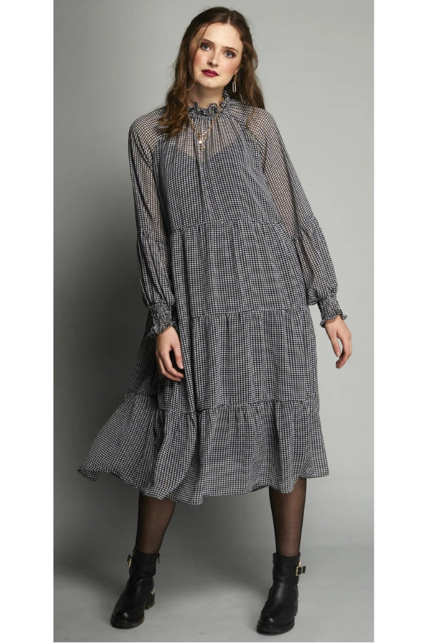 Sellout last season so the Super funky Wendy Dress is back ! Easy to wear pullover Shirring detailed high neck, beautiful bellow sleeve detail with shirring elastic cuff, multi tired maxi dress. Sheer Black/white gingham check fabric with separate Full Slip Black Camisole. Looks great teamed with Boots, Sneakers or dress up with heels