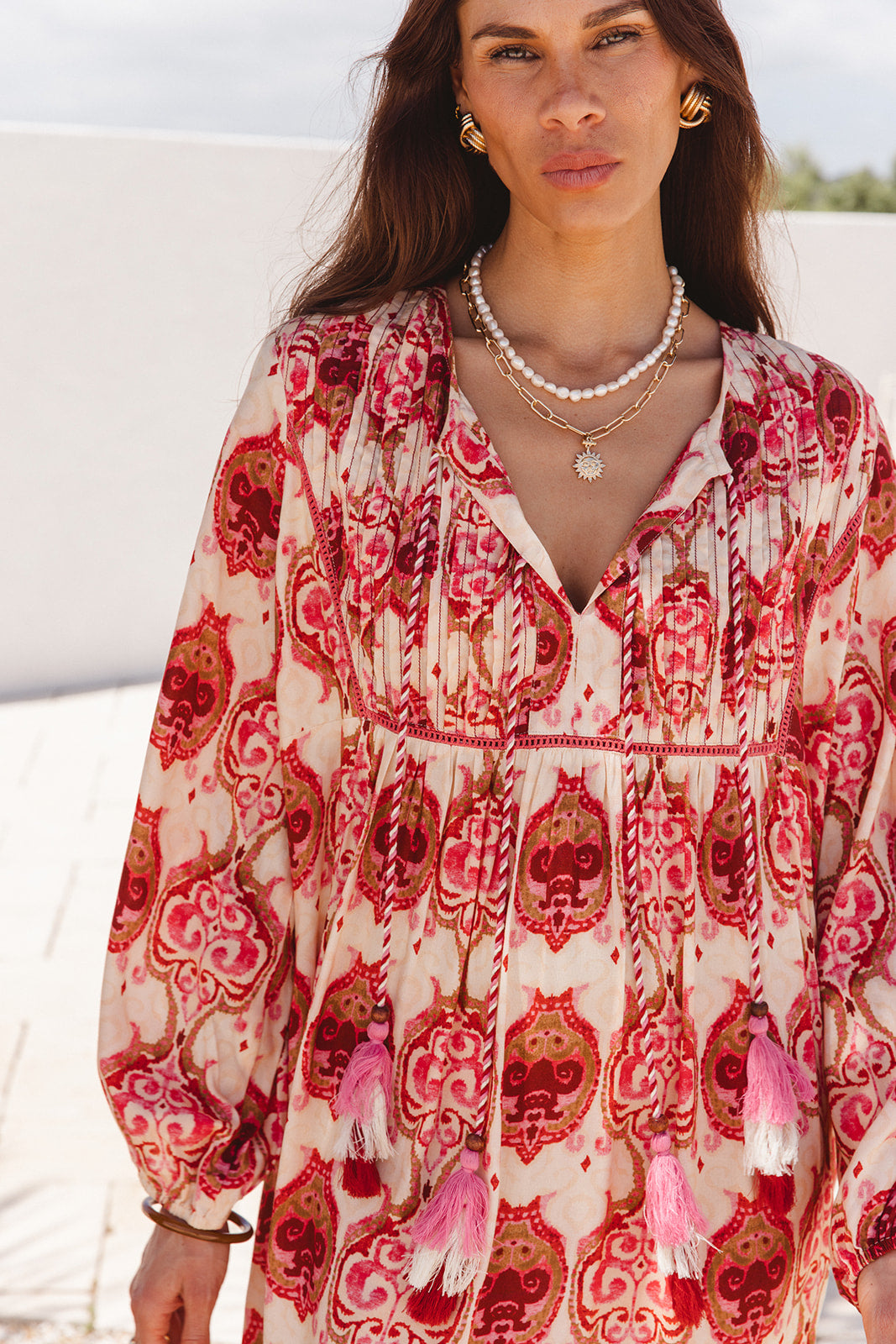 The Boho Maxi in Khalifa Print is the essence of free-spirited elegance. Inspired by the vibrancy of Morocco, this tiered maxi dress captures the soul of souks, rich tapestries, and the romance of desert sunsets. The relaxed silhouette flows with ease, while intricate detailing - soft pleats, tassel ties, and statement sleeves - adds that touch of artisanal charm we love.