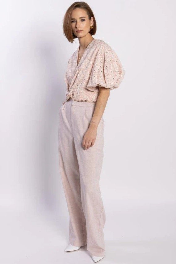 Experience the elegance of the Loughlin Tilly Top in Pink Anglaise. This top features oversized puff sleeves, a wrap front that ties into a knot, and a cropped style. A truly stunning piece that effortlessly transitions from day to night.