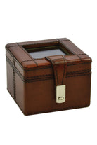 A compact tan leather watch box lined in soft suede, designed with a cushioned interior and built-in mirror to keep your favourite timepiece safely stored and beautifully presented.