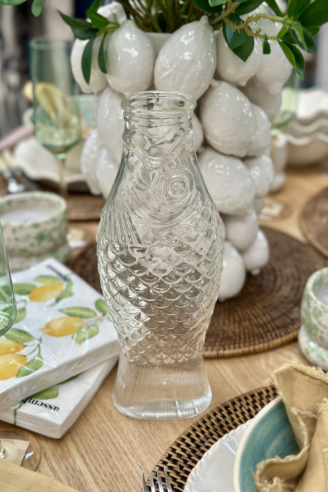 Crafted in translucent glass, its sculptural fish-shaped form brings a splash of coastal charm to the table. Both functional and decorative, it’s perfect for serving water, wine, while simply catching the light on a summer table.