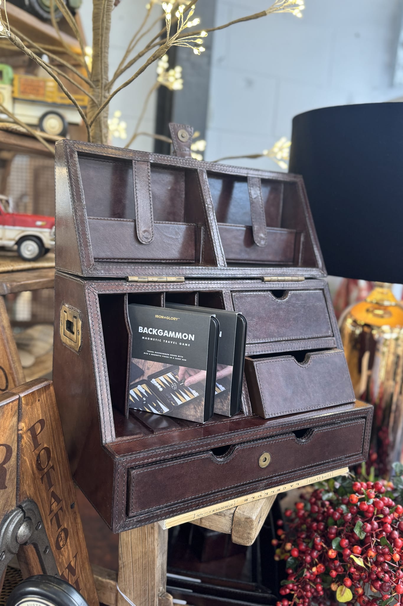 A beautifully crafted leather stationery chest designed for the well-ordered desk, featuring multiple compartments, drawers, and dividers to keep letters, notebooks, pens, and daily essentials elegantly in place; its vintage-inspired form, stitched detailing, and warm tan finish bring a sense of classic refinement to any study, home office, or creative workspace.
