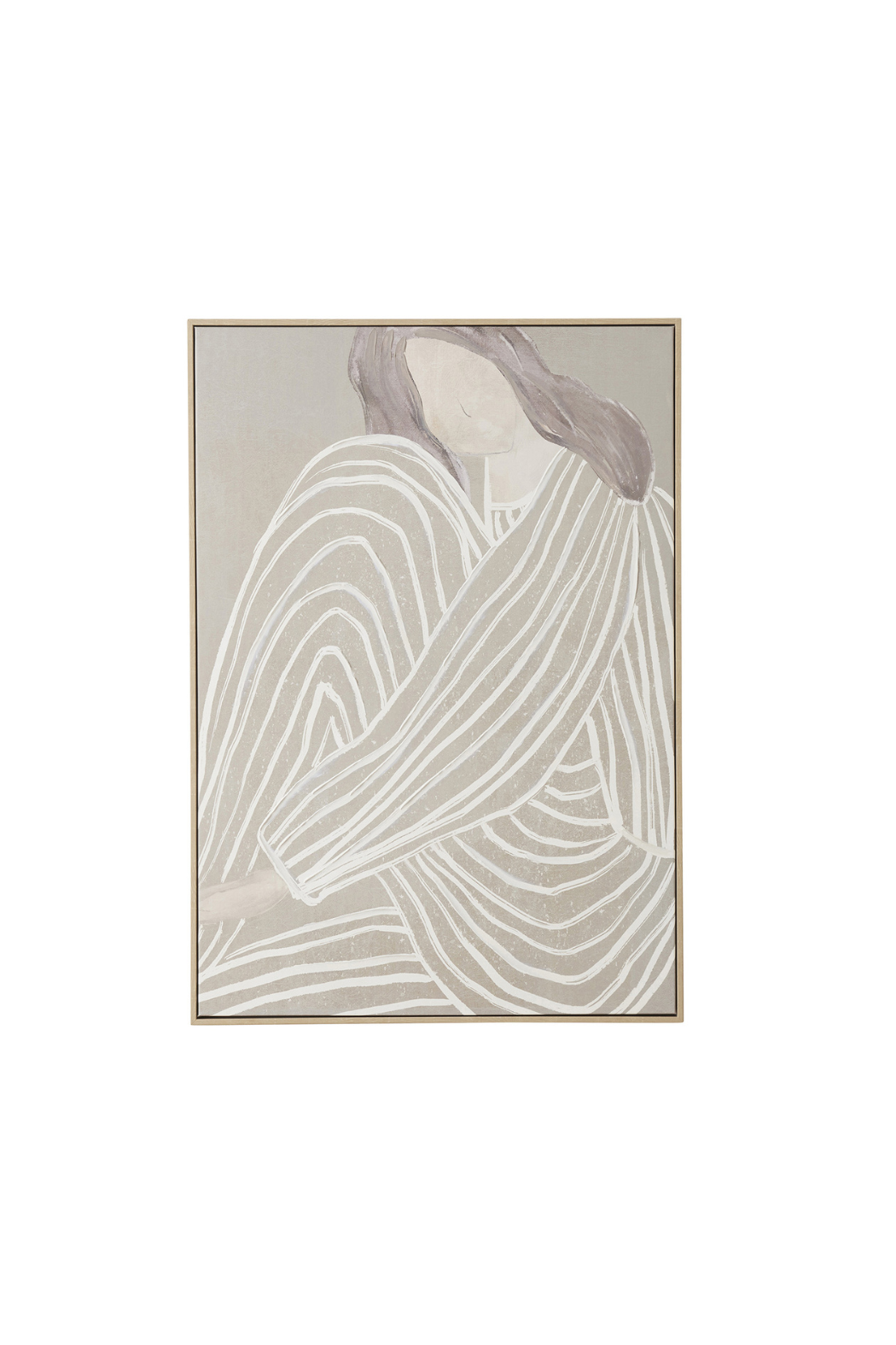 Soft, abstract and full of quiet emotion, this framed print depicts a faceless figure wrapped in flowing, linear forms. The muted palette of taupe, ivory and blush brings a sense of calm, while the sweeping stripes add movement and texture. A modern choice for living spaces, bedrooms or creative corners that lean towards minimalism and tonal styling.