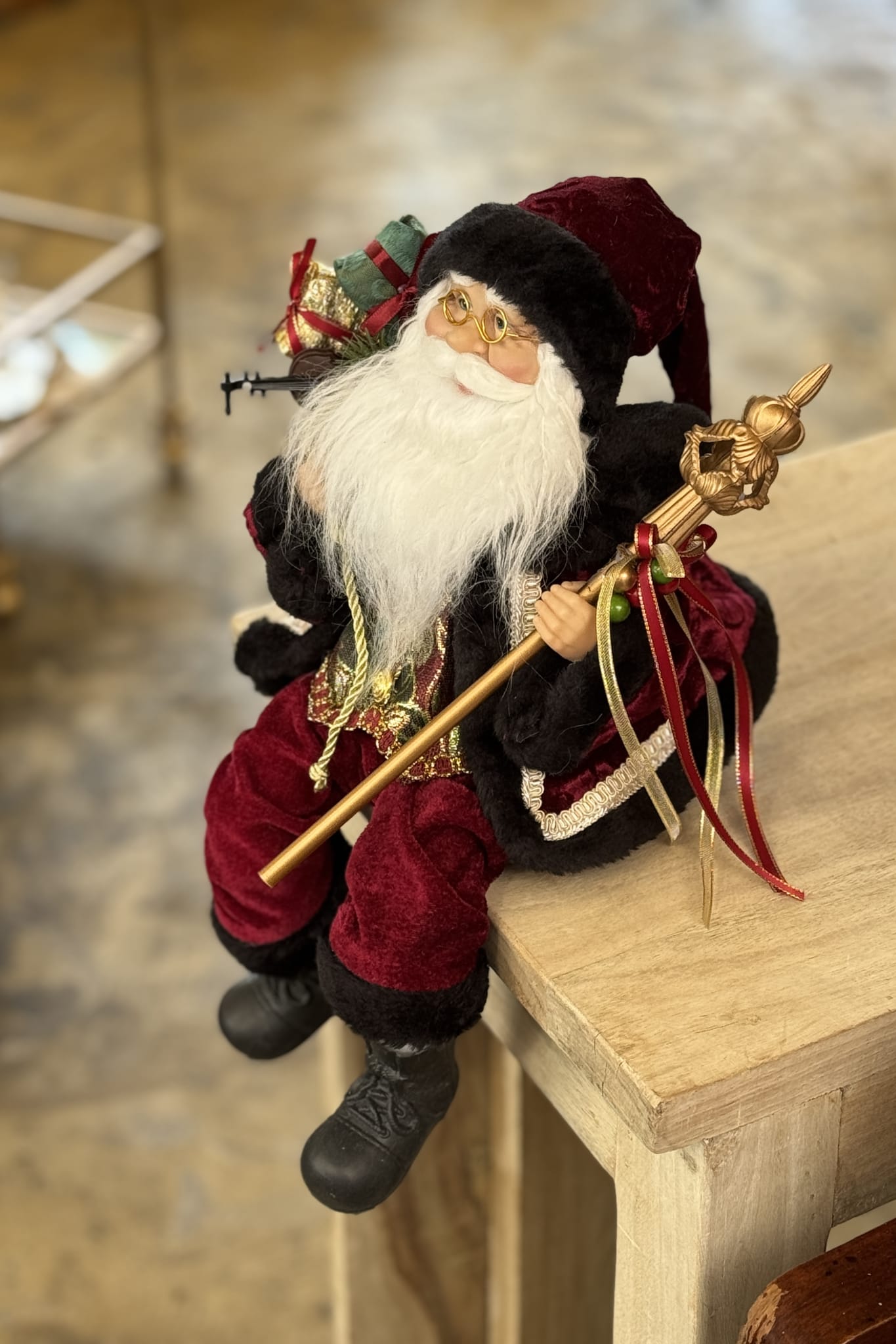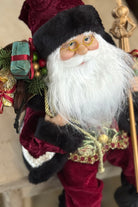 Full of festive spirit, Santa is dressed in a rich burgundy flocked coat trimmed with black. Perched happily with his round gold spectacles, he carries a sack brimming with wrapped toys over one shoulder and a golden staff in the other.