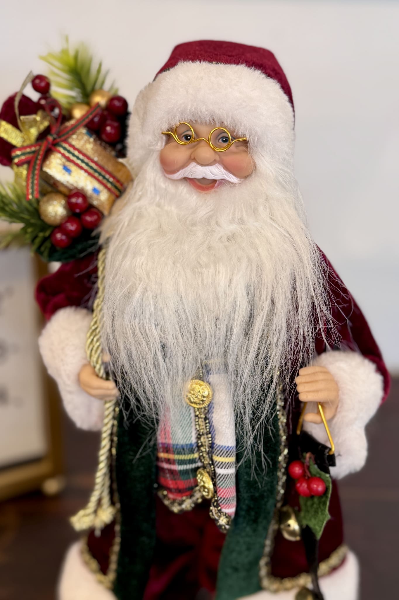 Brimming with festive charm, Santa is dressed in a deep burgundy coat with soft black trim. Wearing his signature smile, he will always bring warmth and cheer to any Christmas display.