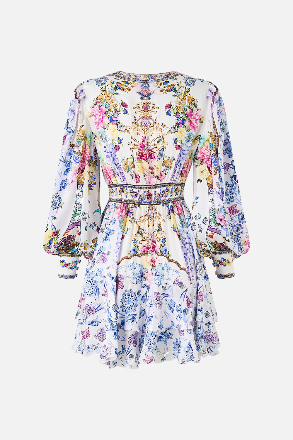 The All About That Lace Button Front Frill Dress is a handcrafted silk silhouette designed by our in house artisans. Reimagined in an exclusive limited edition print, our short fit and flare dress features a V neckline that meets a shaped waistband with an elasticated back for comfort and fit. Finished with button front details and soft frill accents for feminine movement.