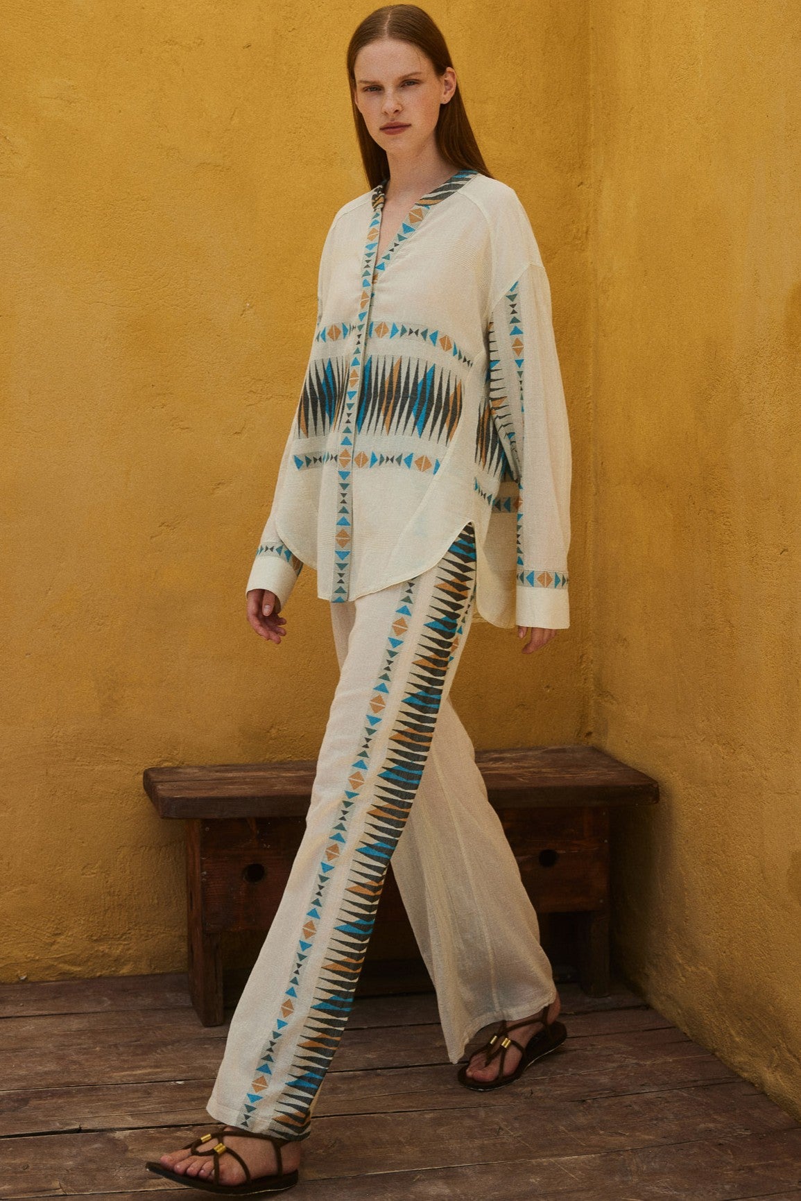 The Devotion Twins Iluma Pant is an effortless statement in soft, textured cotton, designed with a relaxed wide-leg silhouette that moves beautifully with every step. A hand-drawn geometric motif runs along the leg in warm blue and camel tones, adding a quietly graphic edge to the natural base. Light, breathable and thoughtfully cut, this style sits comfortably at the waist and falls with an easy elegance that works just as well barefoot on holiday as it does styled with sandals and a crisp shirt back home. An artful yet wearable piece that brings a sense of global craftsmanship to everyday dressing.