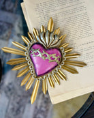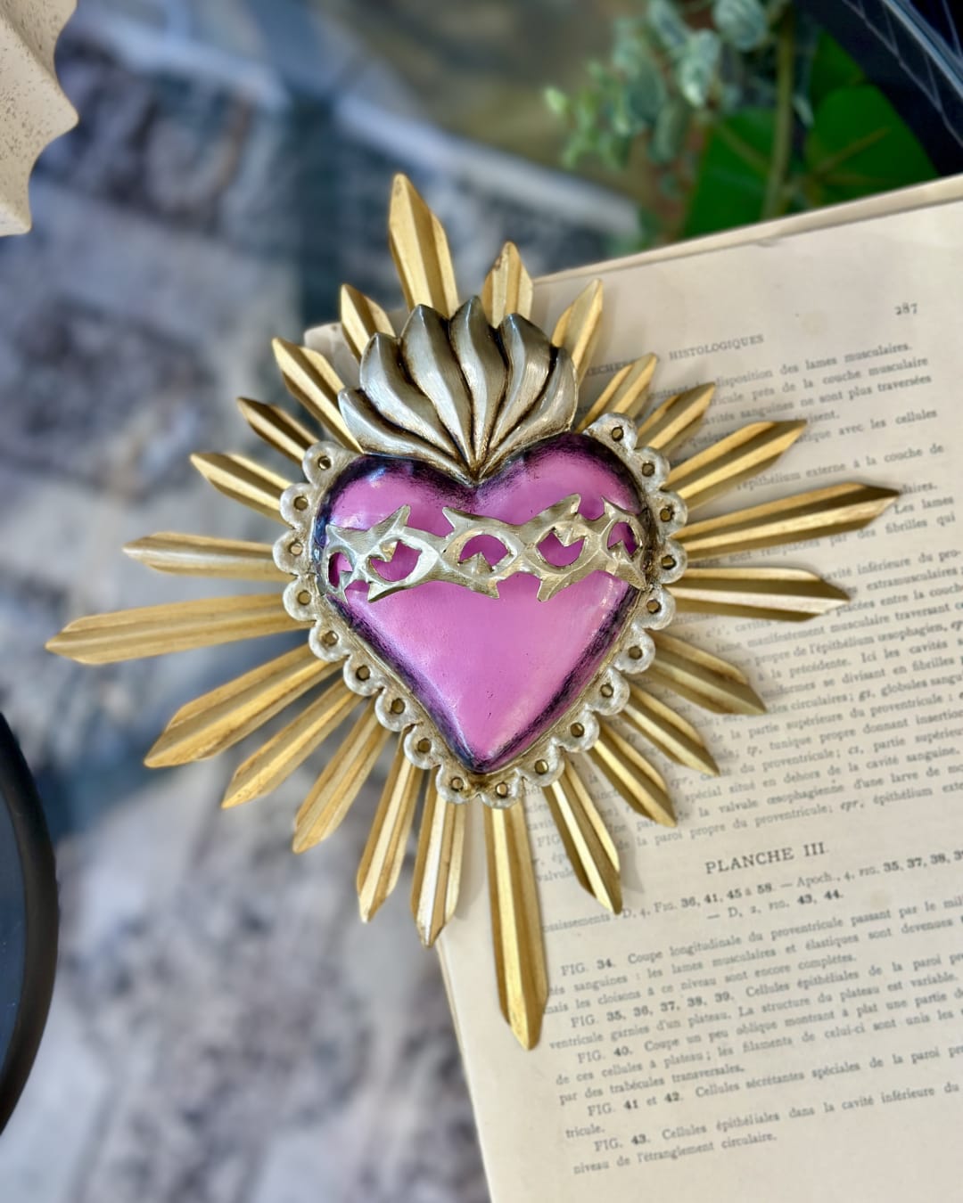 This luminous pink corazón sagrado (sacred heart) bursts with energy, crowned in antique gold rays and wrapped in a sculptural crown of thorns. Hand-formed in tin and painted by artisans in Mexico, it captures the passion and poignancy at the heart of Mexican folk art tradition—now with a bold pop of unexpected colour.