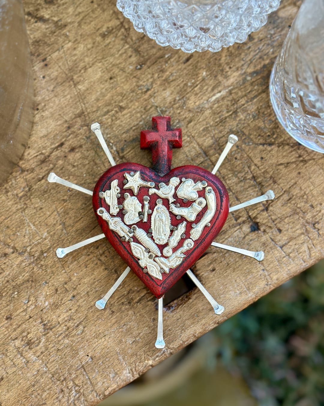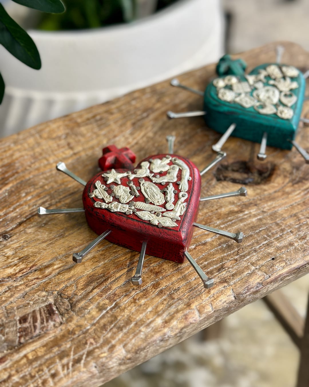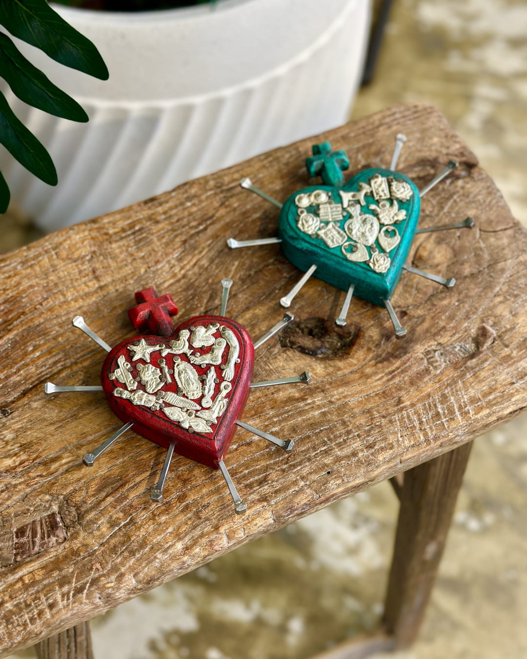 These handcrafted corazones sagrados—or sacred hearts—are beloved icons of Mexican folk art, symbolising love, hope, healing, and miracles. Traditionally used as offerings or tokens of intention, each heart carries a personal story, often adorned with hand-hammered milagros (tiny charms), bold flame motifs, or painted declarations of amor (love).