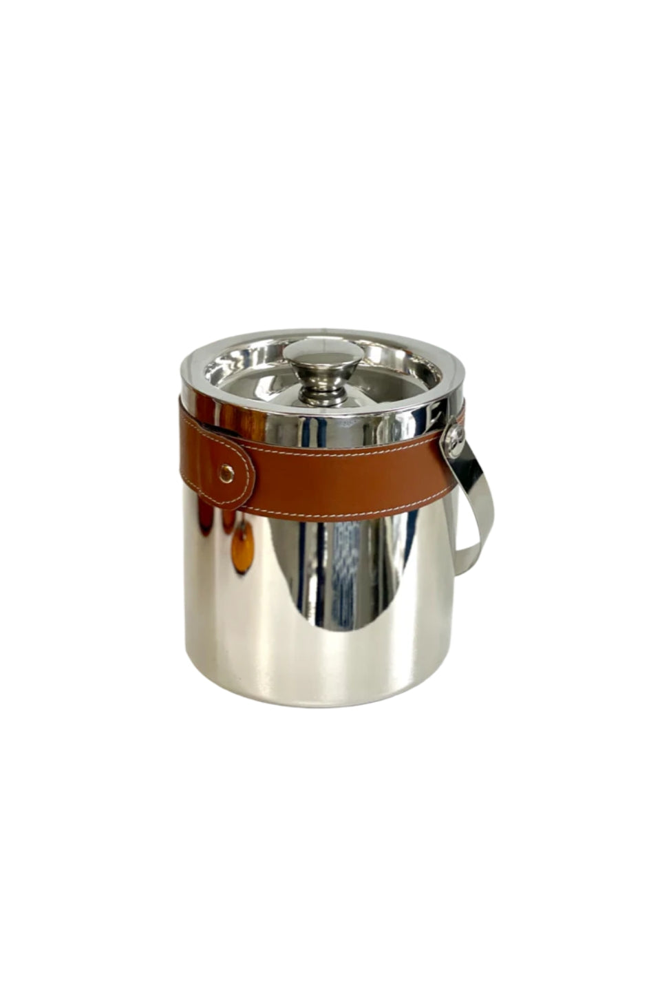 Crafted in polished stainless steel, wrapped with a handsome leather band and topped with a fitted lid, it’s made for gin bars, cocktail soirees, and late-night refills.