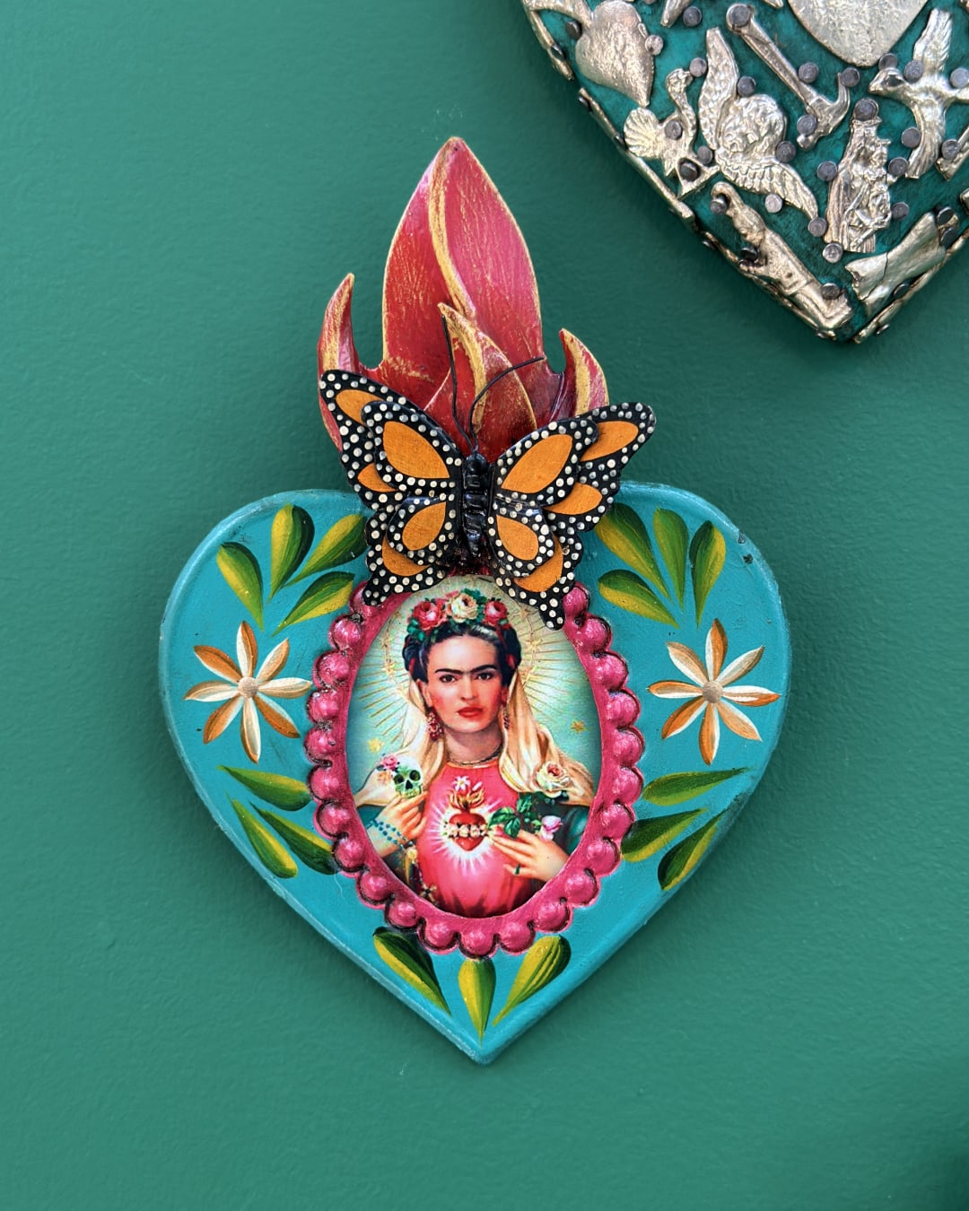 This vibrant Mexican tin heart features a radiant portrait of Frida Kahlo surrounded by hand-painted florals, crowned with a flaming heart and finished with a symbolic butterfly—an emblem of transformation, creativity, and rebirth. The colours sing in bold teal, fuchsia, flame red and orange, making it a true celebration of spirit and artistry.