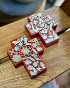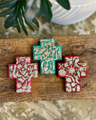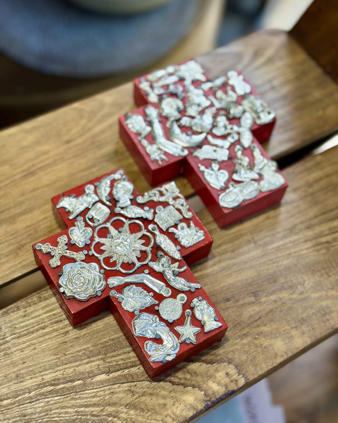 Adorned with tiny metal charms, no two are the same. Whether crafted from rustic wood, detailed tin, or Talavera tile, each cross is a unique token of intention—equal parts artwork and amulet.