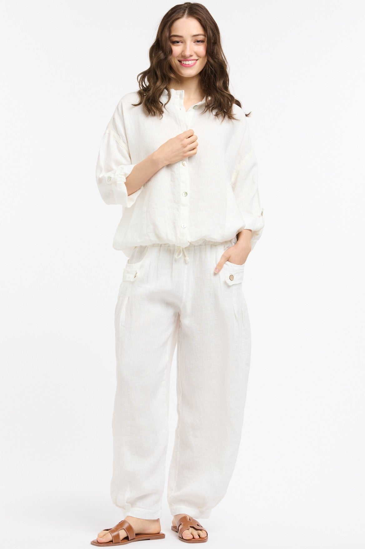 A modern wardrobe staple reimagined in pure linen, this Urban Luxury bomber brings a clean, contemporary line to warm-weather dressing. The relaxed silhouette is balanced by a subtle drawcord hem, giving you the option to shape it to your look. Buttoned cuffs, soft dropped shoulders, and a refined stand collar add quiet structure, while the lightweight linen keeps it breathable and effortless to style.