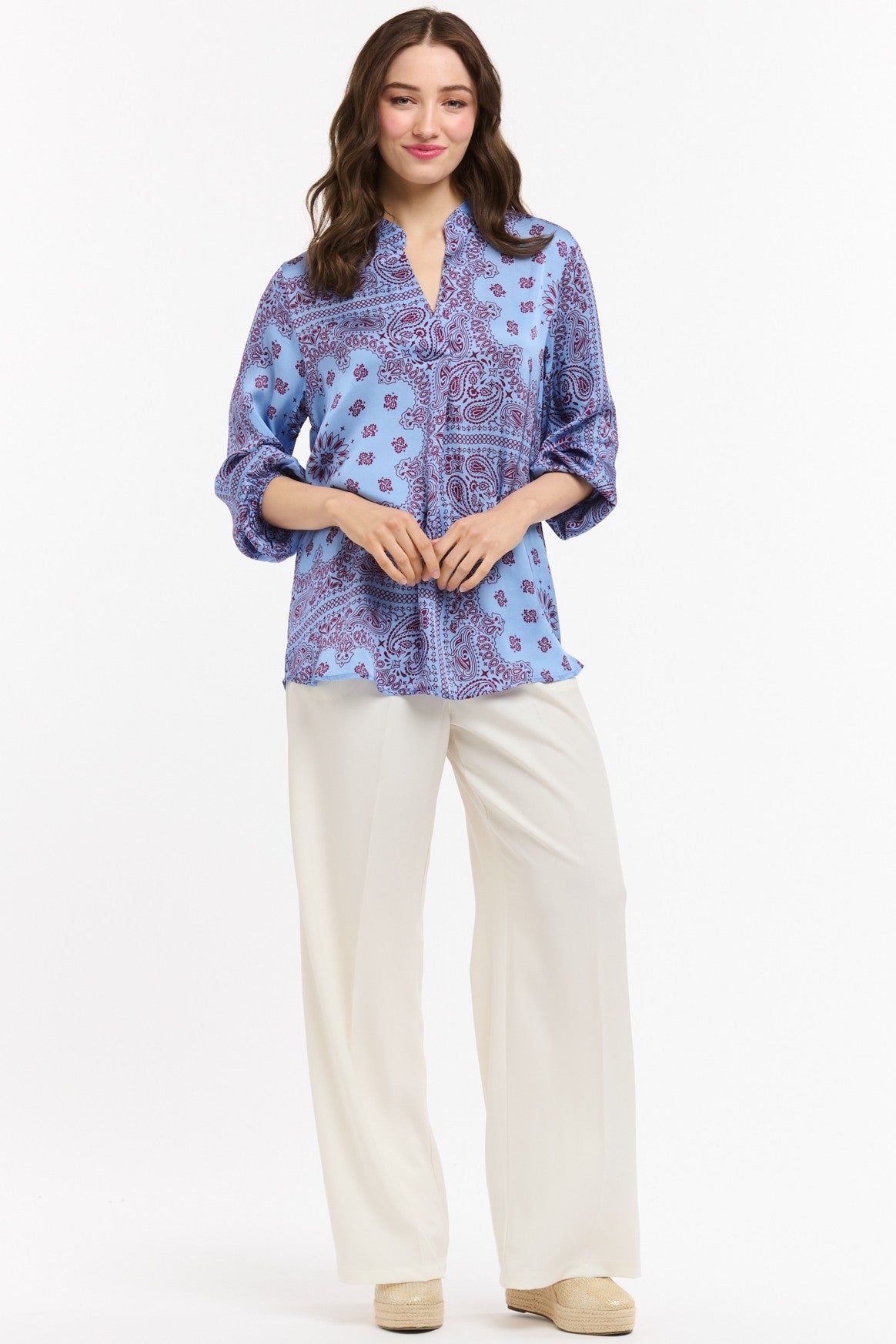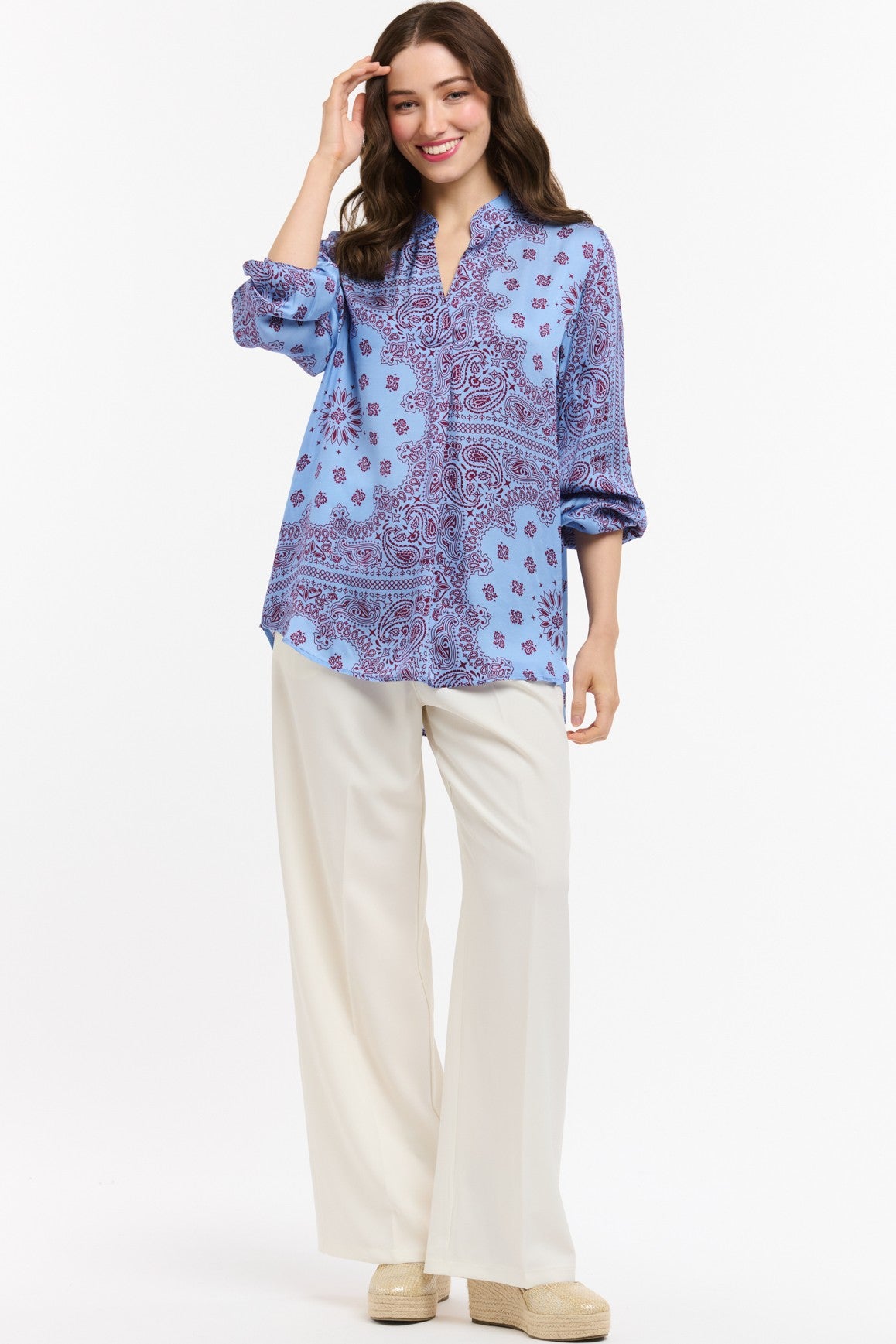 A rich, paisley-inspired print gives this royal blue shirt its standout character, blending intricate detailing with a soft, fluid drape. The notched neckline frames the face beautifully, while the relaxed fit and rolled sleeves keep the silhouette easy and modern. Light against the skin and naturally flattering, it’s a piece that works just as well with tailored pants as it does with denim — a refined pop of colour for any day of the week.