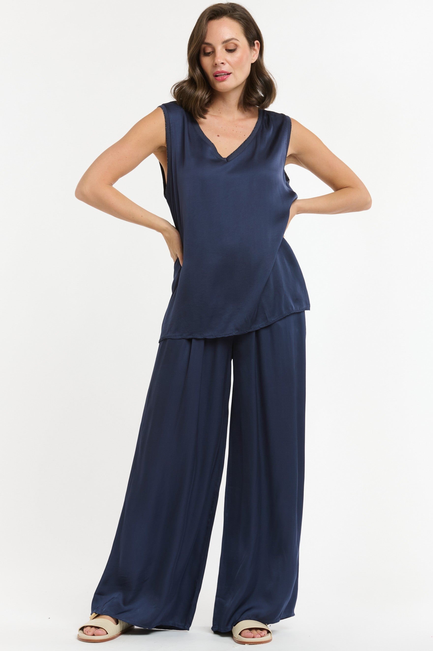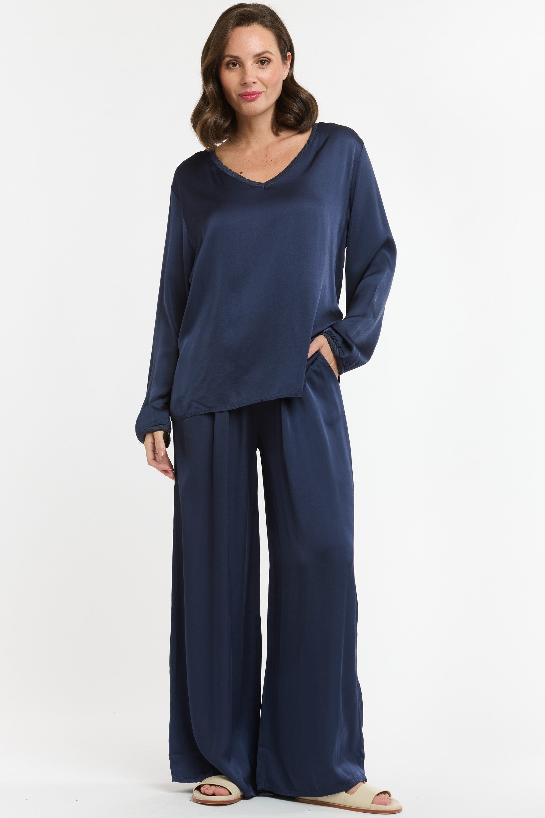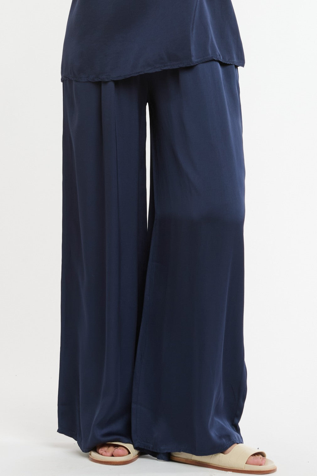 A fluid, modern silhouette defines these wide-leg pants in deep navy. Designed to move with quiet grace, they fall beautifully from the waistband without bulk, creating a long, uninterrupted line. The fabric has a soft sheen and an almost weightless feel, making them an ideal choice for warm evenings, relaxed dressing, or pairing with silkier tops.