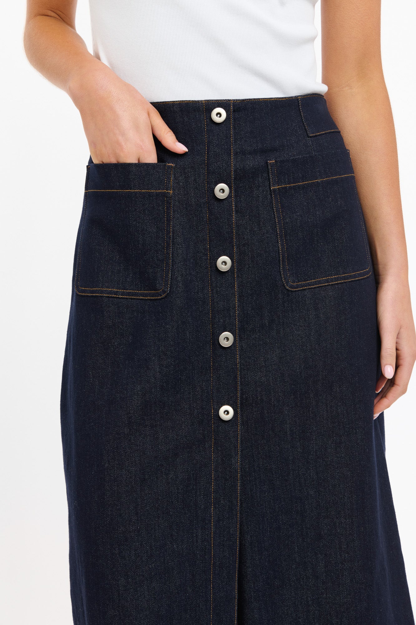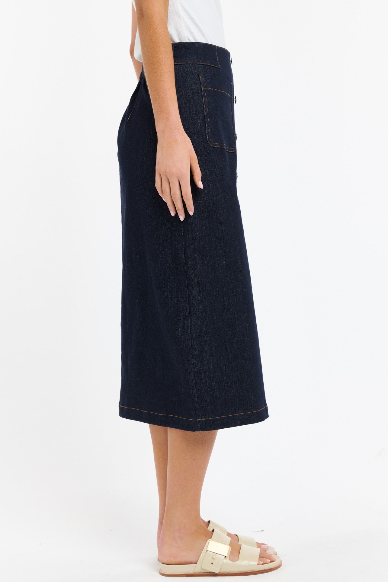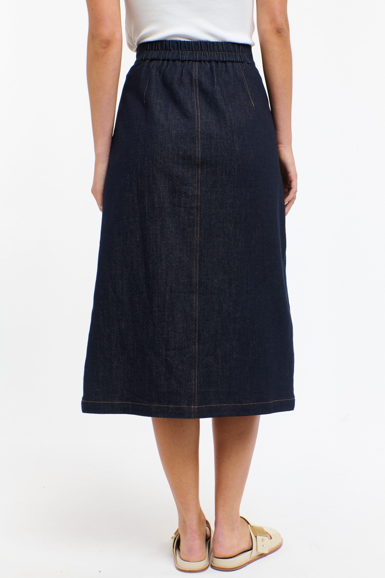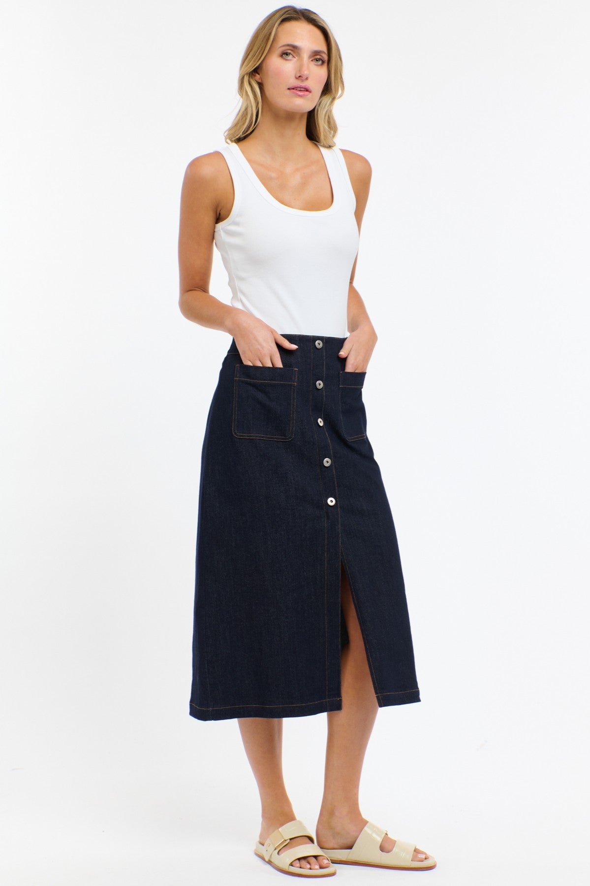 Structured yet softly flattering, the Carrie Skirt is your denim done differently. Crafted in deep indigo with contrast topstitching, this midi skirt features statement buttons through the front, roomy patch pockets, and a clean A-line silhouette that hits mid-calf. Perfect with tanks, tees, or the matching vest for a fresh take on denim-on-denim styling.