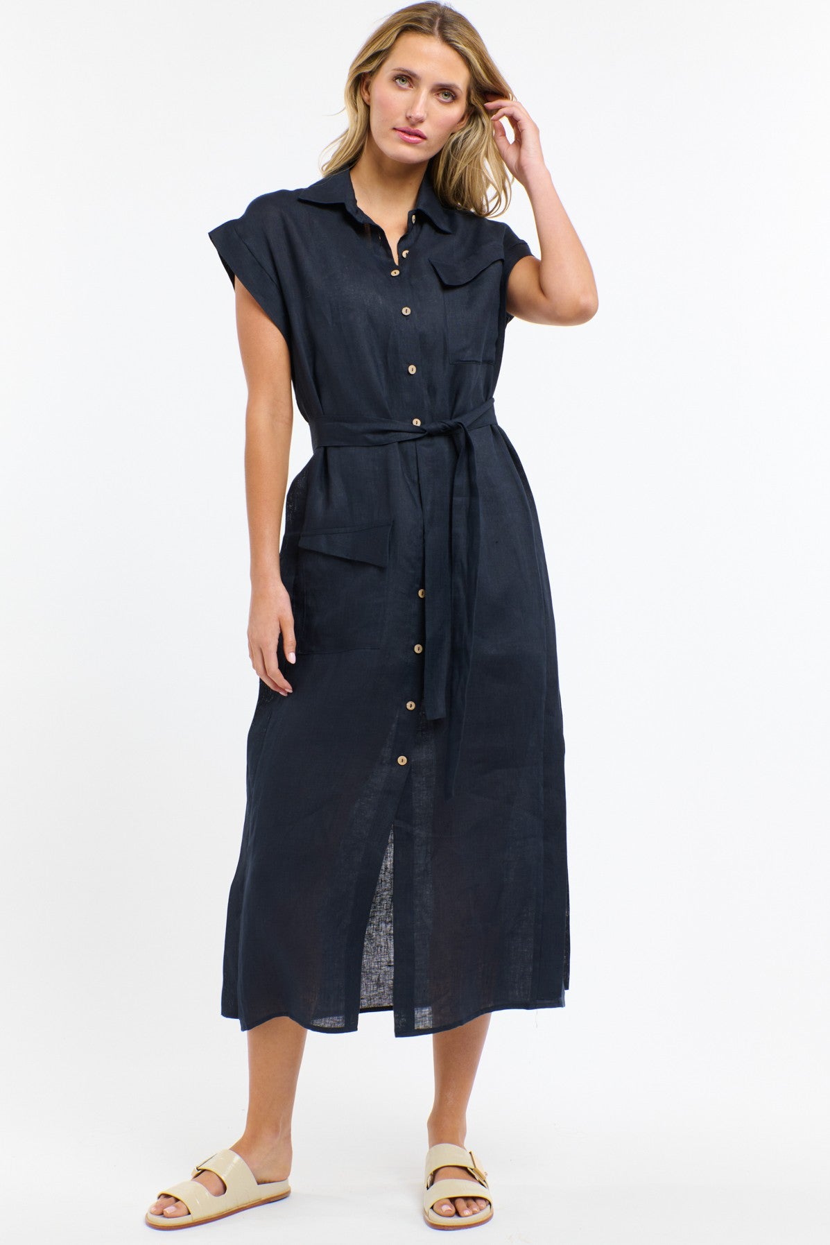 Cool, classic, and made for sun-drenched days, the Estivo Linen Dress is a warm-weather staple. Crafted in breathable 100% linen, this cap-sleeve shirt dress is designed with utilitarian patch pockets, a button-through front, and a self-tie belt to cinch the waist. Its versatile silhouette can be worn loose and relaxed or belted for a more tailored shape — perfect from market mornings to alfresco evenings.