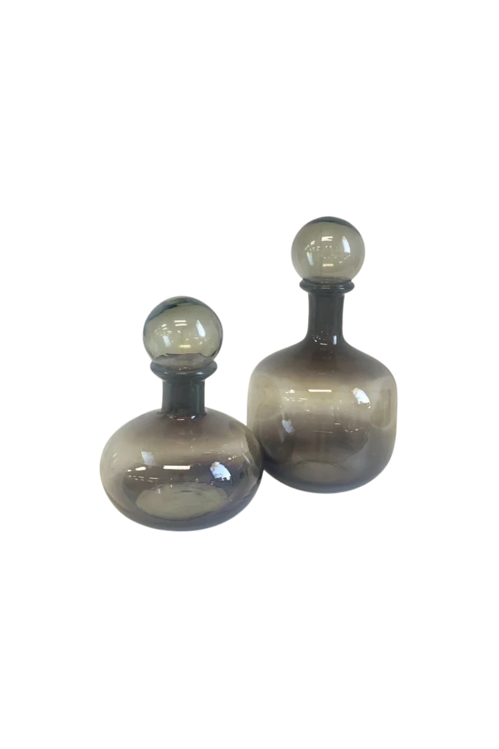 With its elongated neck and oversized stopper, this smoke glass decanter captures the glamour of grand hotel bars. It will add atmosphere and intrigue whether styled on a bar, console or display shelf.