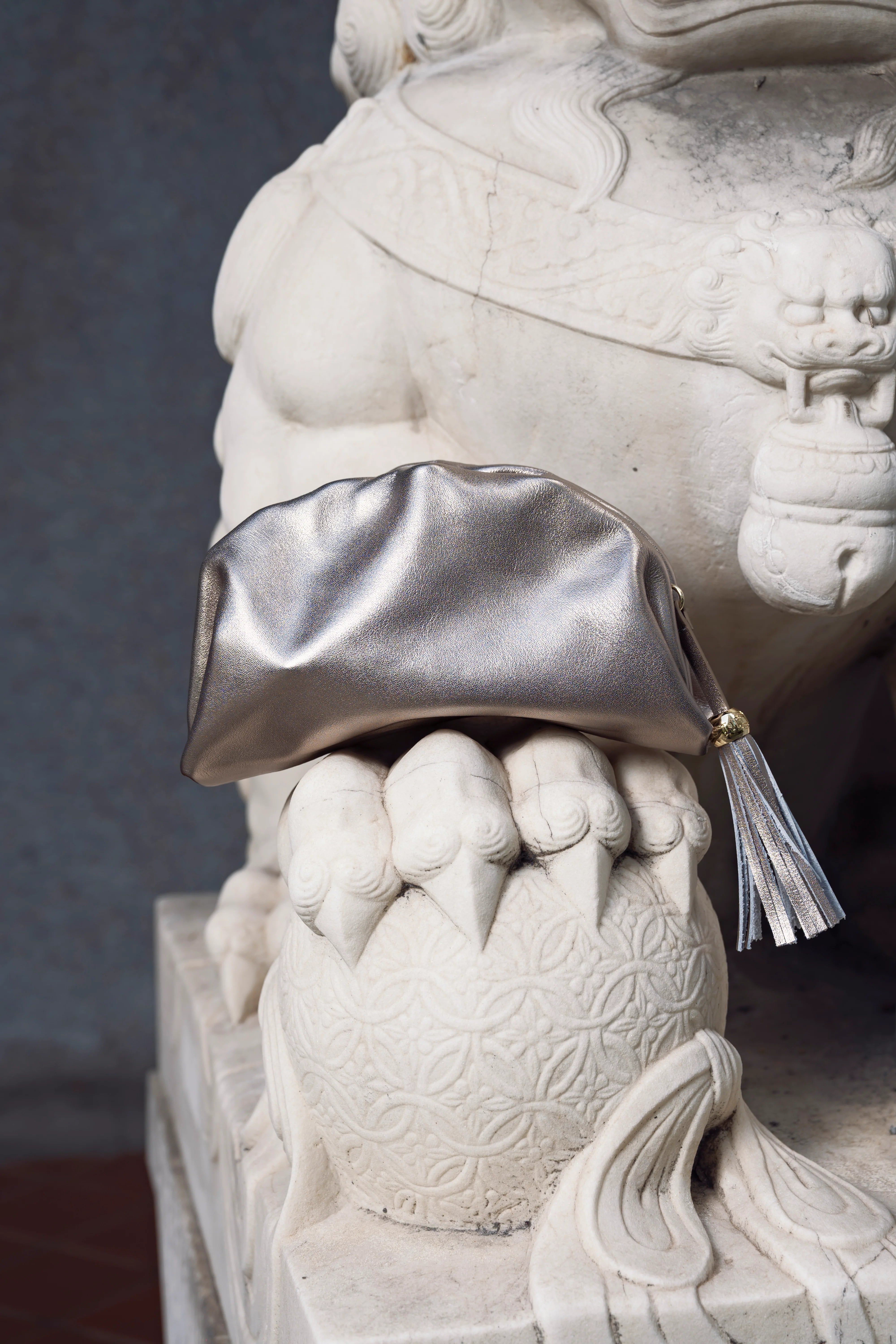 This beautifully proportioned pleated pouch makes a statement with its super stylish champagne gold leather. Suited for both day and night, It can be carried as a clutch/wrist bag with the shorter metal chain or worn as a crossbody with the longer adjustable matching leather strap. Both straps are detachable and the dumpling has a square clam snap closure.