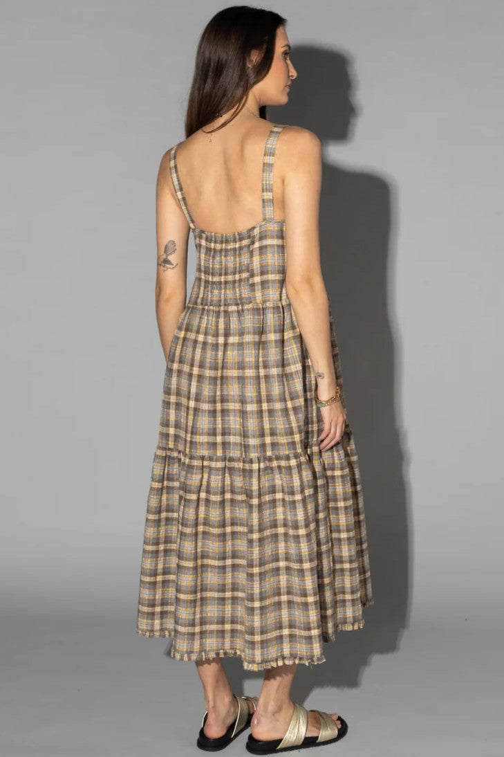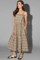 The Earth Dress - Ground Check, the epitome of a perfect sundress in its natural tones. This midi-length tiered dress is not only stylish but also functional, featuring convenient pockets for your essentials. The adjustable straps, adorned with sleek metal hardware, ensure a customized fit. Moreover, the shirred panel at the back adds an extra touch of comfort. For those cooler days, this dress effortlessly pairs with a t-shirt underneath, creating a chic ensemble. Elevate your wardrobe with this versatile and effortlessly elegant Earth Dress - Ground Check.