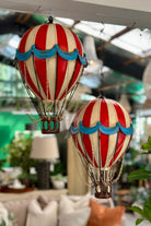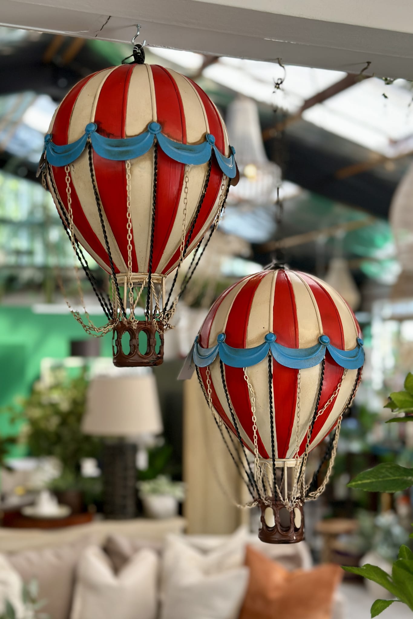 A nostalgic hot air balloon with all the charm of old-world travel. With its striped canopy, scalloped trim and delicate chain detailing, it has the look of a vintage carnival piece, that once floated above fairs, fields and storybook skies.
