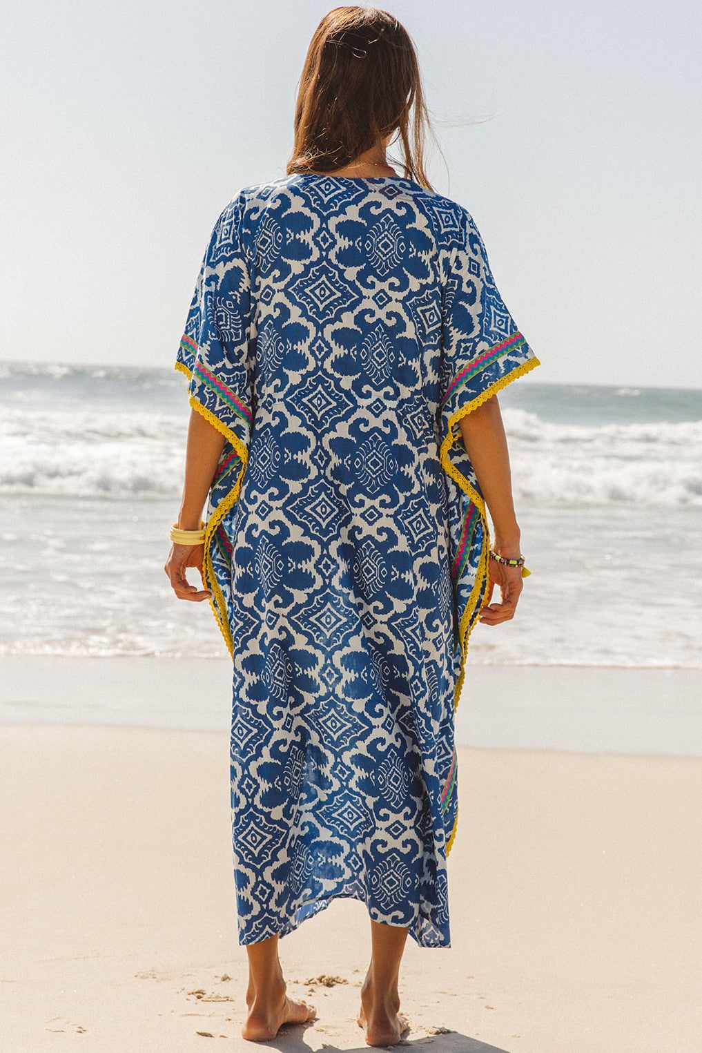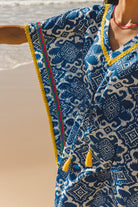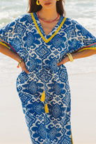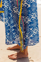 The Amaru Kaftan in Amalfi Print is a celebration of colour, movement and carefree summer spirit. Crafted in a flowing, relaxed silhouette, it drapes beautifully over the body with a softly defined V neckline, adjustable drawstring waist and side splits that allow for effortless ease and movement. The bold cobalt base is brought to life with intricate Mediterranean-inspired motifs, finished with vibrant contrast trims and playful tassel ties that add a handcrafted feel. Designed for barefoot beach walks, poolside lounging or long lunches in the sun, this kaftan slips on with ease and delivers instant impact while remaining light, breathable and endlessly wearable.
