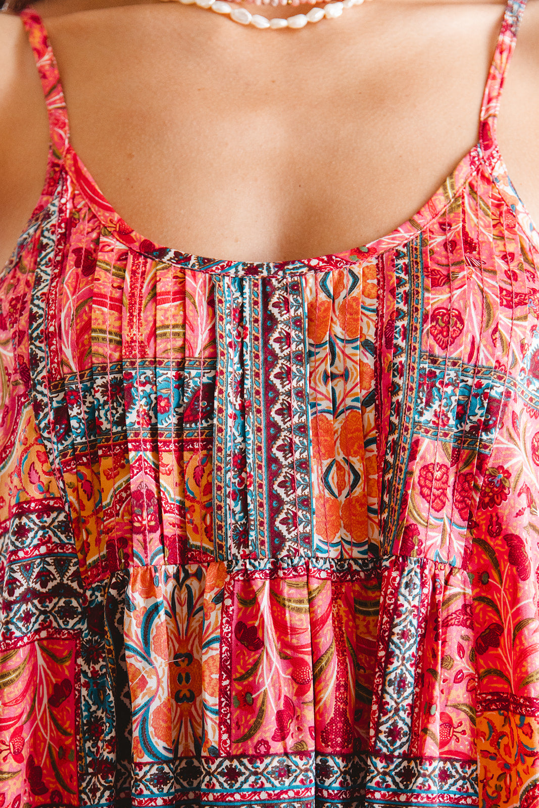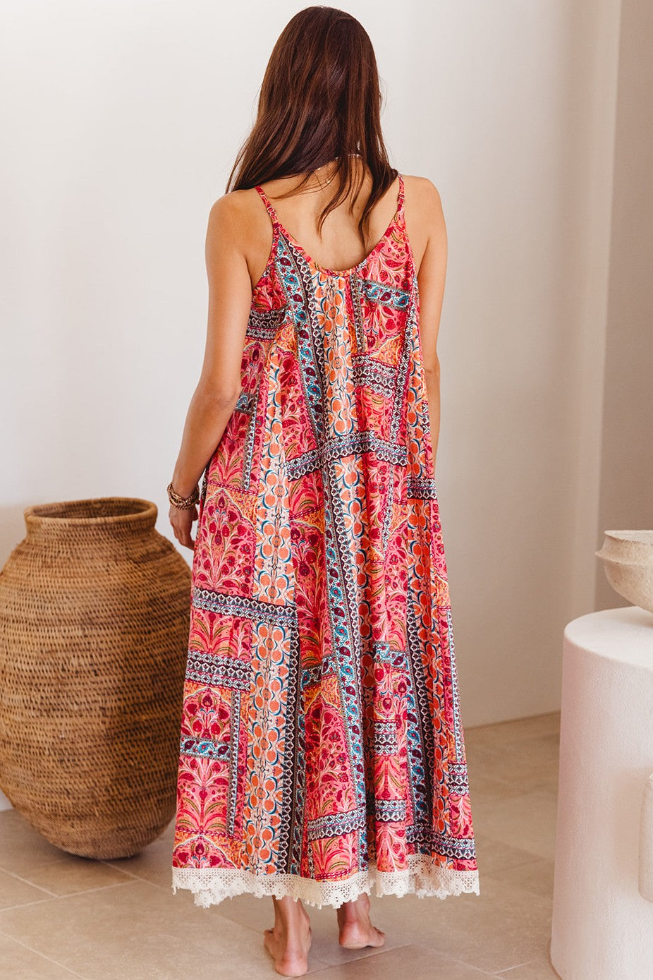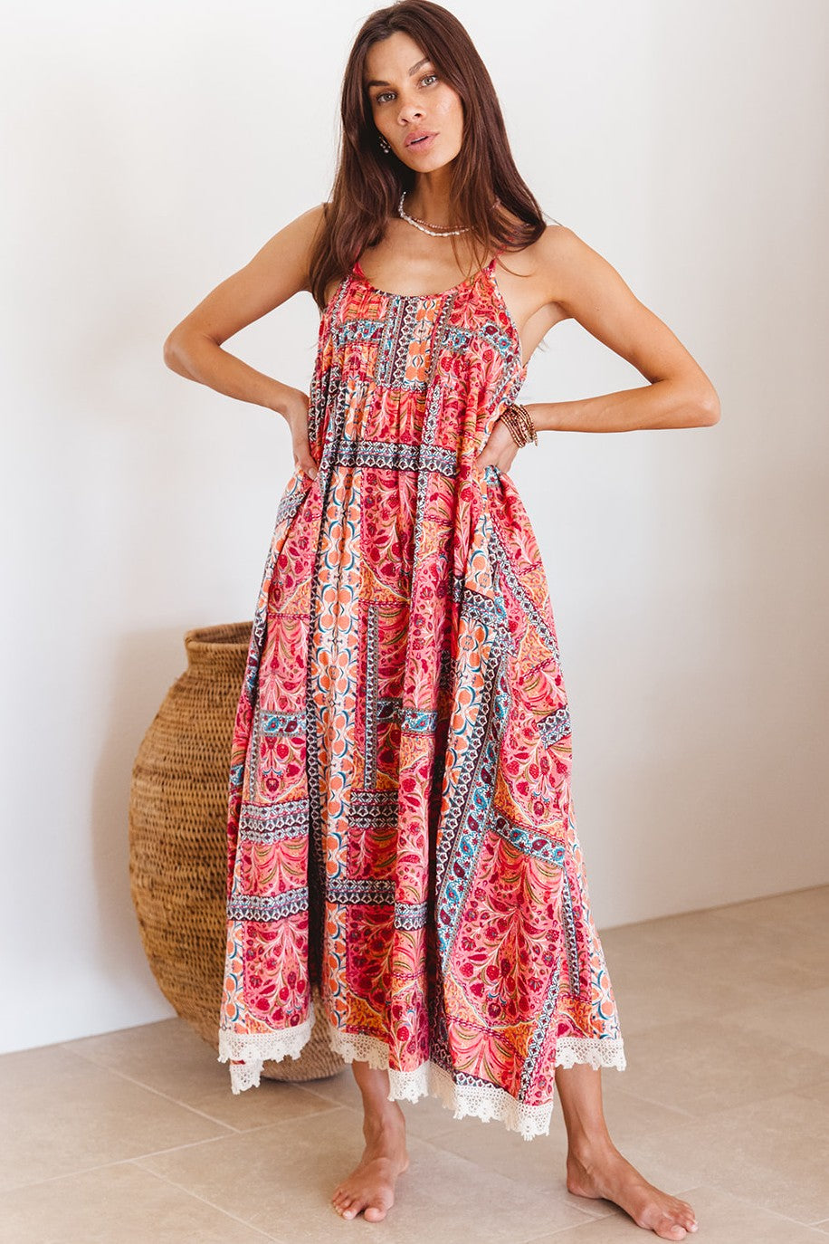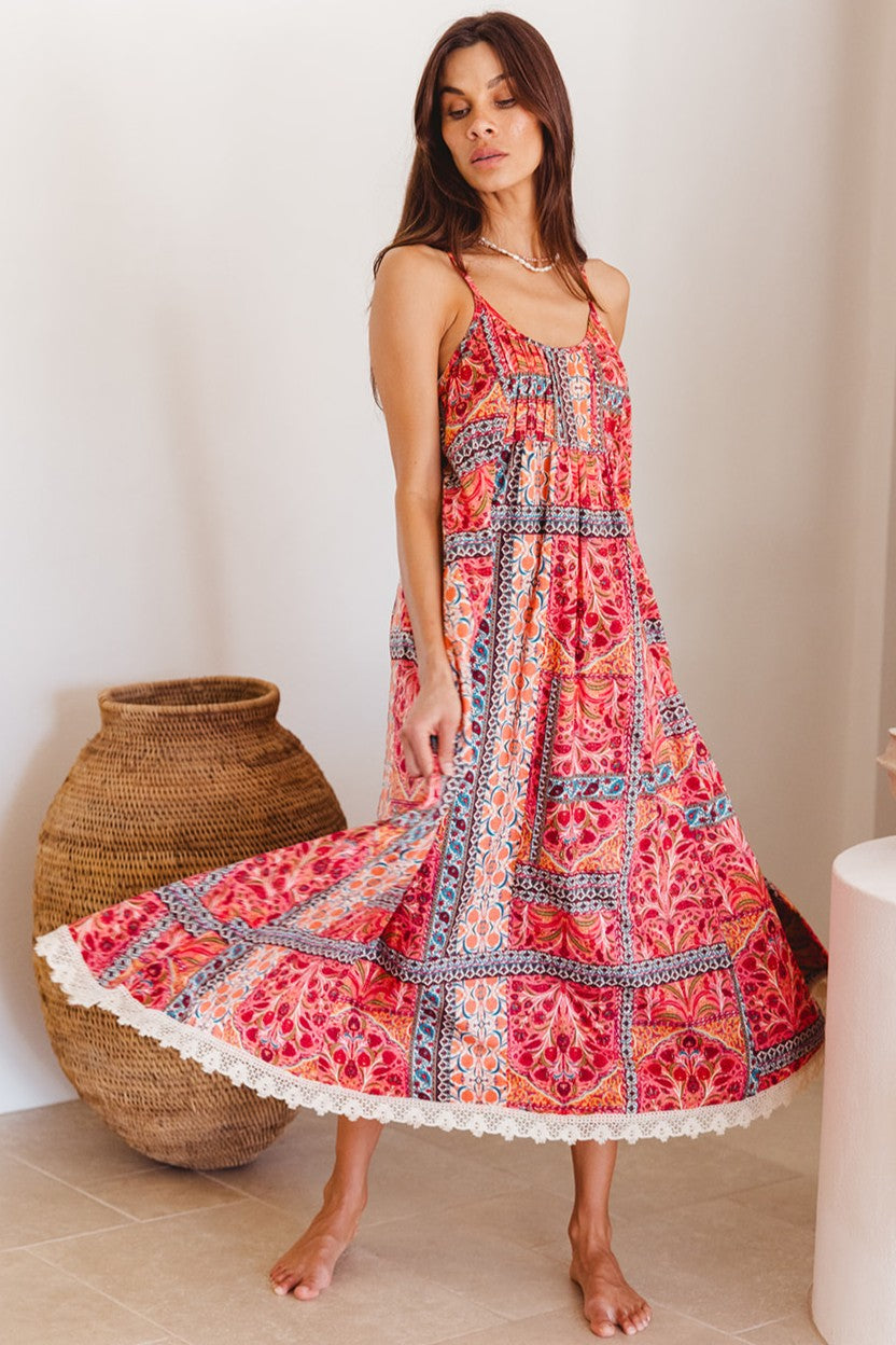 A true free spirit piece, the Innova Maxi in the ‘Temple’ print is summer made effortless. With its rich, sunset-toned patchwork of bohemian florals and mosaic borders, this easy-fit maxi dress flows with every step. Fine adjustable straps and a gathered bodice offer shape without structure, while the soft cotton and crochet hem whisper of faraway lands and barefoot days. From resort brunches to beachside evenings, this is the one you’ll reach for again and again.