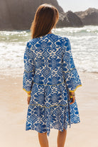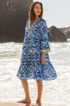 The Miska Dress in the Amalfi Print is an easy, throw-on summer piece with a distinctly Mediterranean mood. Designed in a relaxed tiered silhouette, it features a soft V neckline with delicate contrast trim, long blouson sleeves finished with fine detailing, and a gently flared skirt that moves beautifully with the body. The rich cobalt and white Amalfi print brings a bold yet wearable statement, while the lightweight fabrication keeps it cool and comfortable on warm days. Perfect for beachside lunches, holiday wandering or simply slipping on with sandals for everyday ease, this is a dress that feels effortless, joyful and endlessly summery.
