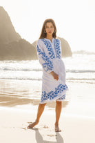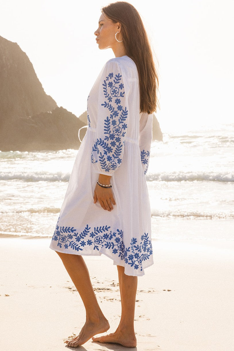 Light, airy and beautifully detailed, the Ruby Dress in Sofia Aari is designed for warm days that drift easily from beach to town. Crafted in sheer, lightweight cotton, it features striking blue embroidery through the bodice, sleeves and hem, creating a bold contrast against the crisp white base. The softly gathered waist with adjustable drawstring allows you to shape the silhouette to suit, while the relaxed skirt moves freely with every step. Finished with long sleeves and a gentle neckline split, it’s a piece that feels considered yet carefree, perfect worn over swimwear or styled with sandals for sunlit afternoons and holiday wandering.