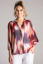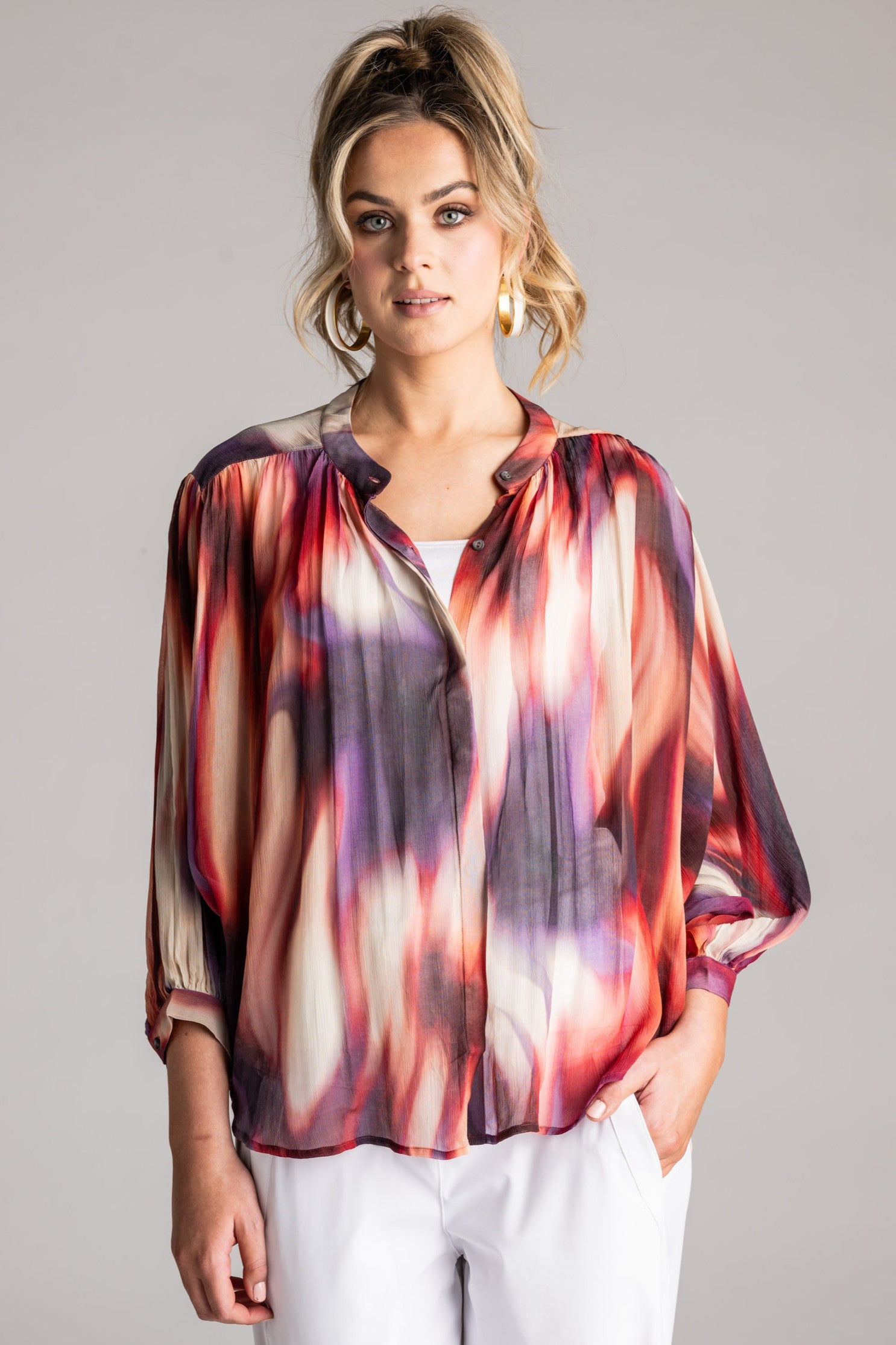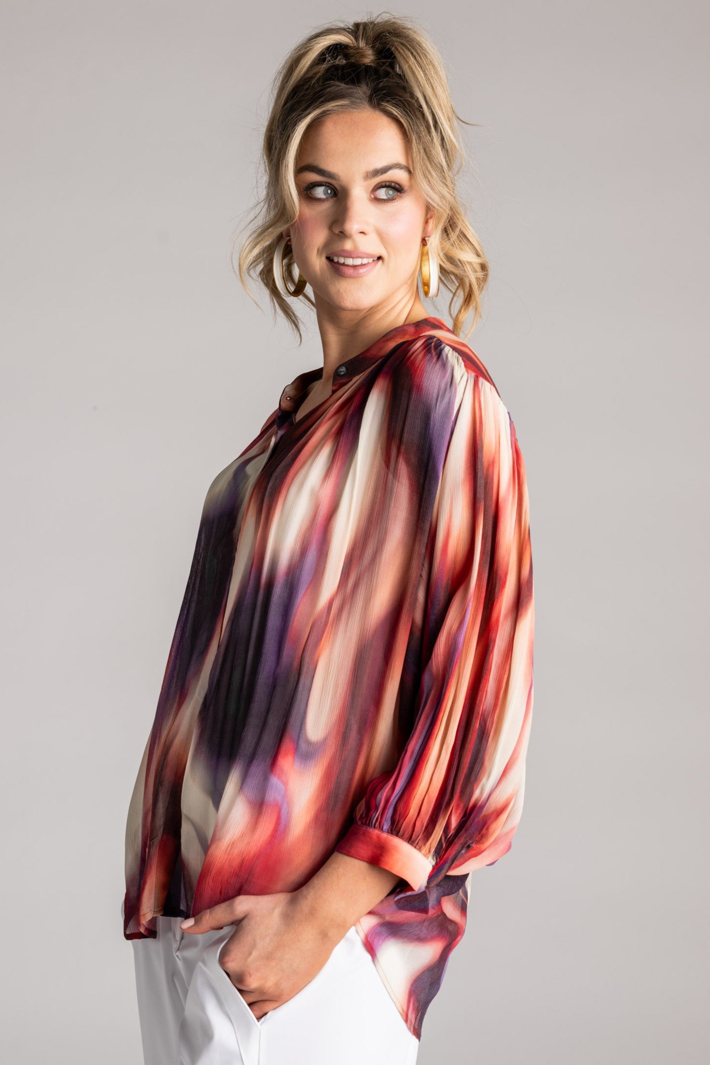 Like a sunset caught in silk, the Blaze Blouse by Lauren Vidal shimmers with painterly swirls of red, coral, plum and cream. Crafted in a whisper-light fabric with a subtle pleat detail through the front, it floats effortlessly over the body, offering a flattering silhouette with a soft mandarin collar and relaxed sleeves. An artful addition to your wardrobe, this blouse brings light and movement to your look—whether tucked into tailored trousers or worn loose over summer whites. Striking, feminine, and easy to wear.