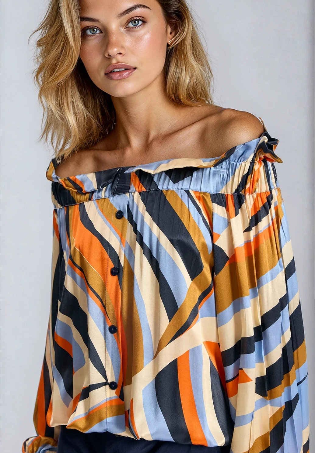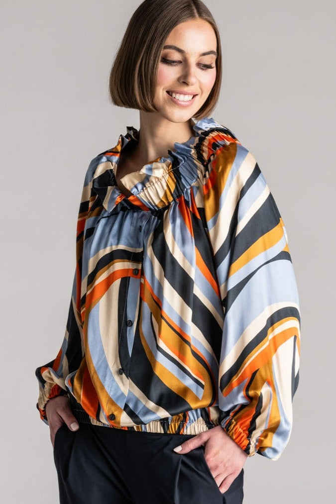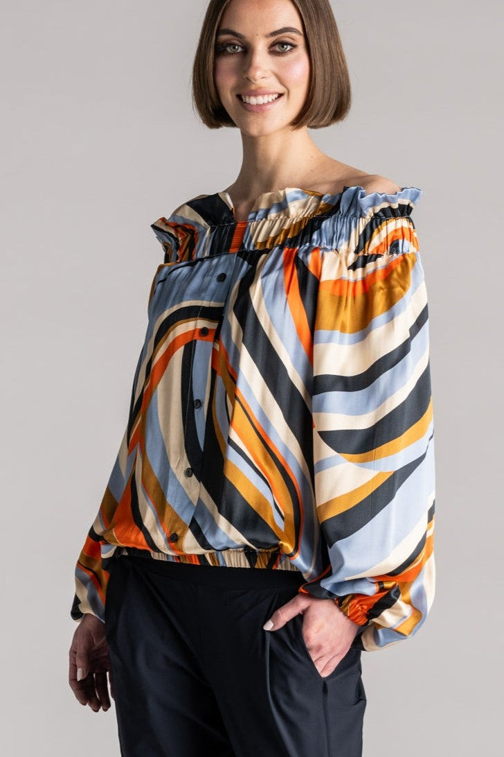 The swirling abstract print brings together burnt orange, amber, blue and soft cream in a palette that feels both retro and fresh. Wear it buttoned up for a refined finish, or off one shoulder for a more playful mood. Looks especially striking paired with black pants or white linen for sun-drenched days and balmy nights.