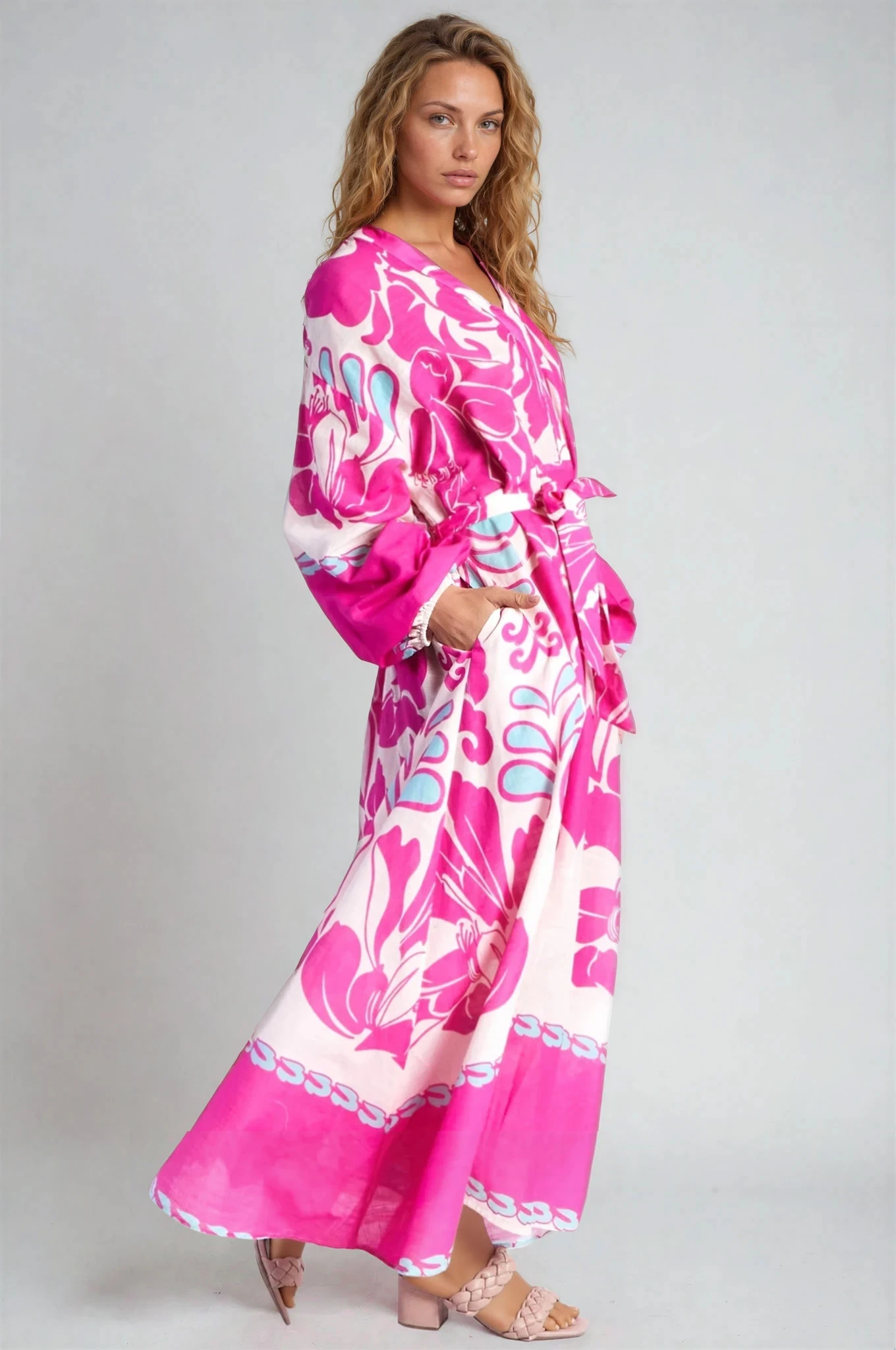 Bold yet beautifully composed, the Leoni Capri Dress in Pink Print is designed for the woman who enjoys making a statement while still feeling completely at ease in what she wears. The softly draped bodice and gentle V neckline create an elegant line through the upper body, while the adjustable waist tie allows you to define your shape in a way that feels comfortable and natural, skimming the body rather than clinging. The flowing skirt offers movement and ease through the hips, creating a balanced, forgiving silhouette that feels confident and feminine from every angle. Crafted in lightweight, breathable cotton with a soft handle, the fabric feels beautiful on the skin and wears effortlessly through warm days, travel and occasions where comfort matters as much as impact. Striking yet surprisingly versatile, this is a dress that works just as well with sandals for daytime as it does dressed up for evenings, making it a joyful investment you will return to again and again. Discover why women return to pieces like this season after season.