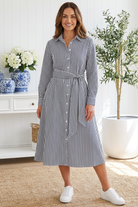 Confident, polished and endlessly wearable, the Leoni Lika Shirt Dress in Navy Stripe is the kind of piece that makes getting dressed feel effortless. The classic shirt dress silhouette is softened by a gently defined waist tie, allowing you to shape the fit to suit you while still skimming the body rather than clinging, creating a flattering, balanced line through the bust, waist and hips. The vertical stripe works cleverly to elongate the silhouette, while the relaxed skirt offers ease and movement, making it comfortable and forgiving for all day wear. Crafted in breathable cotton with a crisp yet soft handle, the fabric feels fresh on the skin and holds its structure beautifully, giving you that pulled-together look without feeling restrictive. Perfect for work, travel or relaxed weekends styled with trainers or sandals, this is a reliable wardrobe staple designed to be worn often and loved for years to come. A refined wardrobe choice you will feel sure of every time you put it on.