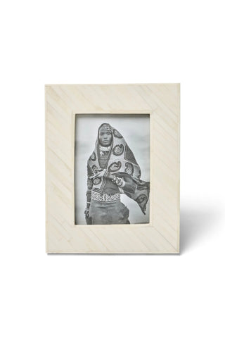 The Osaget Photo Frame. This striking design is handcrafted from bone inlaid in a diagonal pattern. This frame is made to fit your 5x7 images.