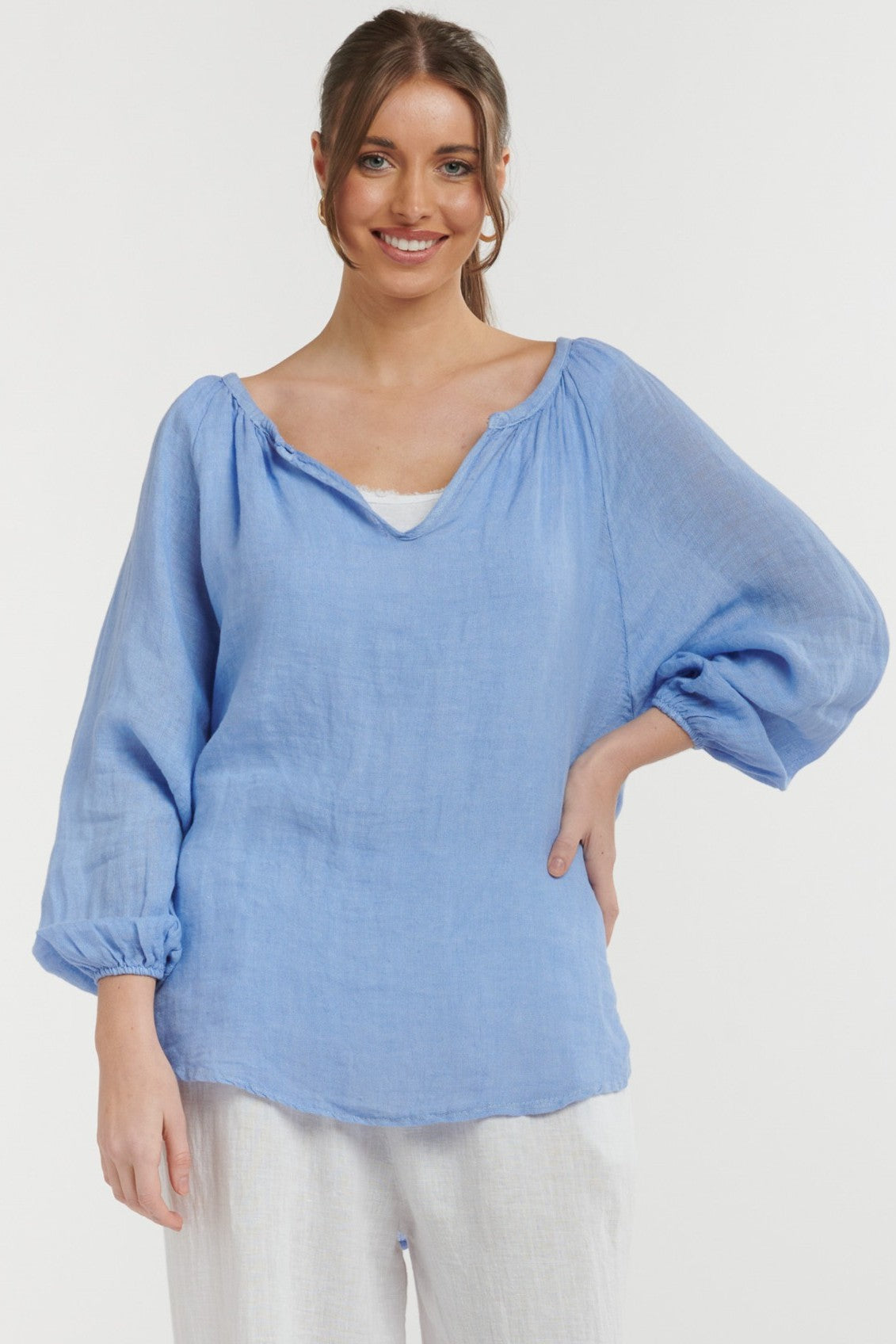 Light, airy, and beautifully relaxed, this linen top brings an easy softness to warm-weather dressing. The gathered neckline creates a gentle scooped shape, while the billowed sleeves add volume without overwhelming the silhouette. Crafted in breathable linen with a subtly curved hem, it’s the kind of piece that feels effortlessly wearable — simple, flattering, and perfect for pairing with linen pants, denim, or summer skirts.