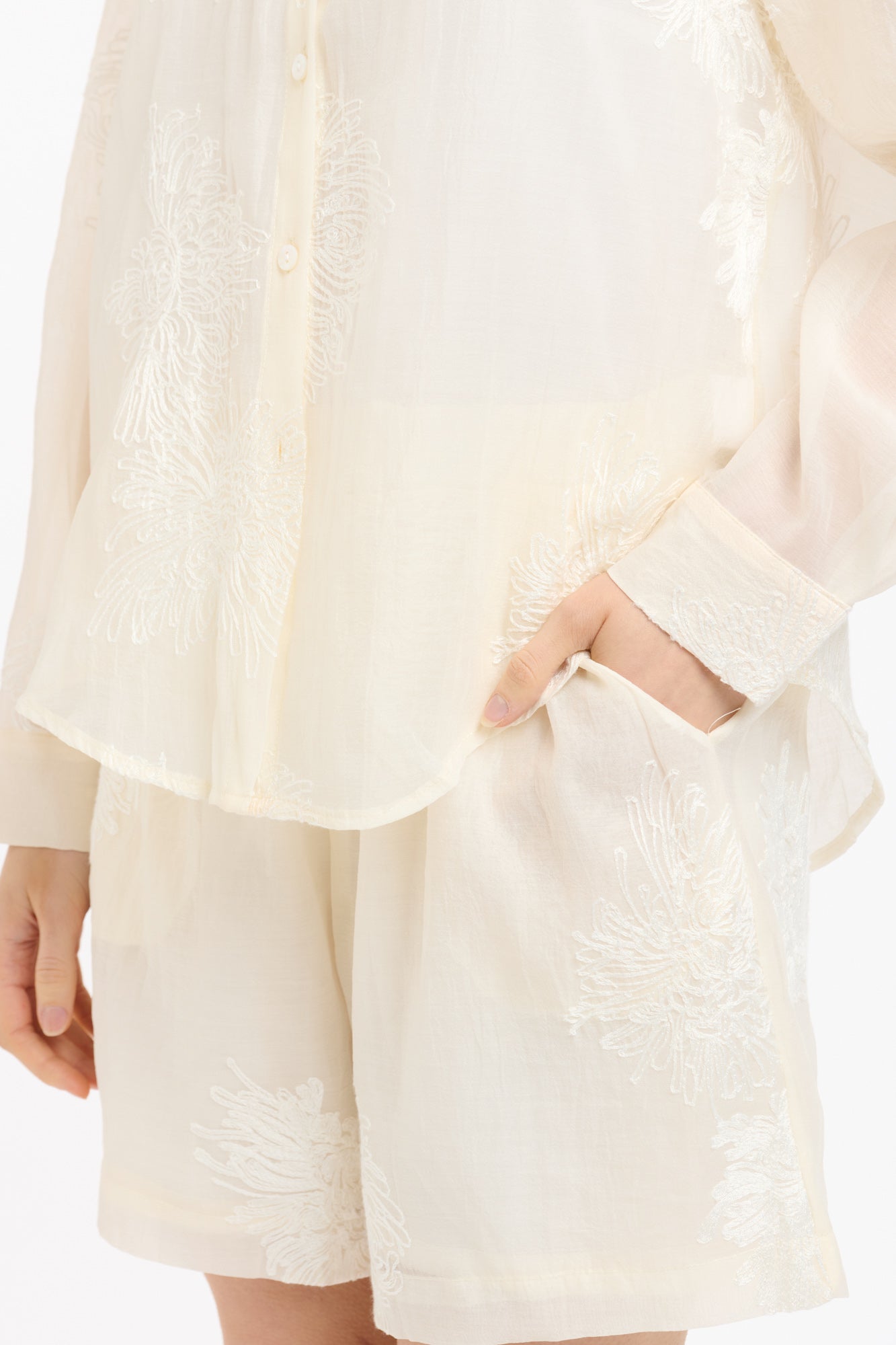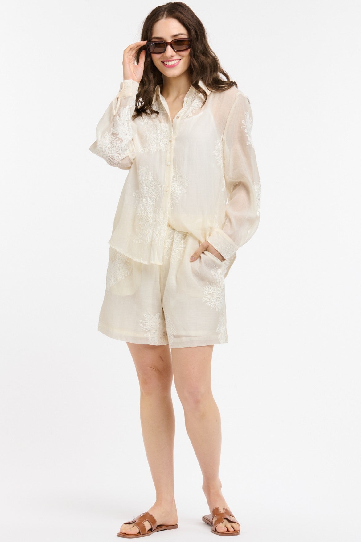 Light, airy and quietly refined, these beige shorts are cut from a sheer, softly structured fabrication and scattered with tonal floral embroidery for subtle texture. The relaxed leg and comfortable waistband keep the fit easy, while side pockets add a practical touch. Style them with the matching embroidered shirt or a simple tank for a polished warm-weather look.