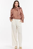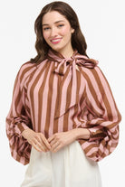 URBAN LUXURY Striped Bow Neck Blouse - Brown
