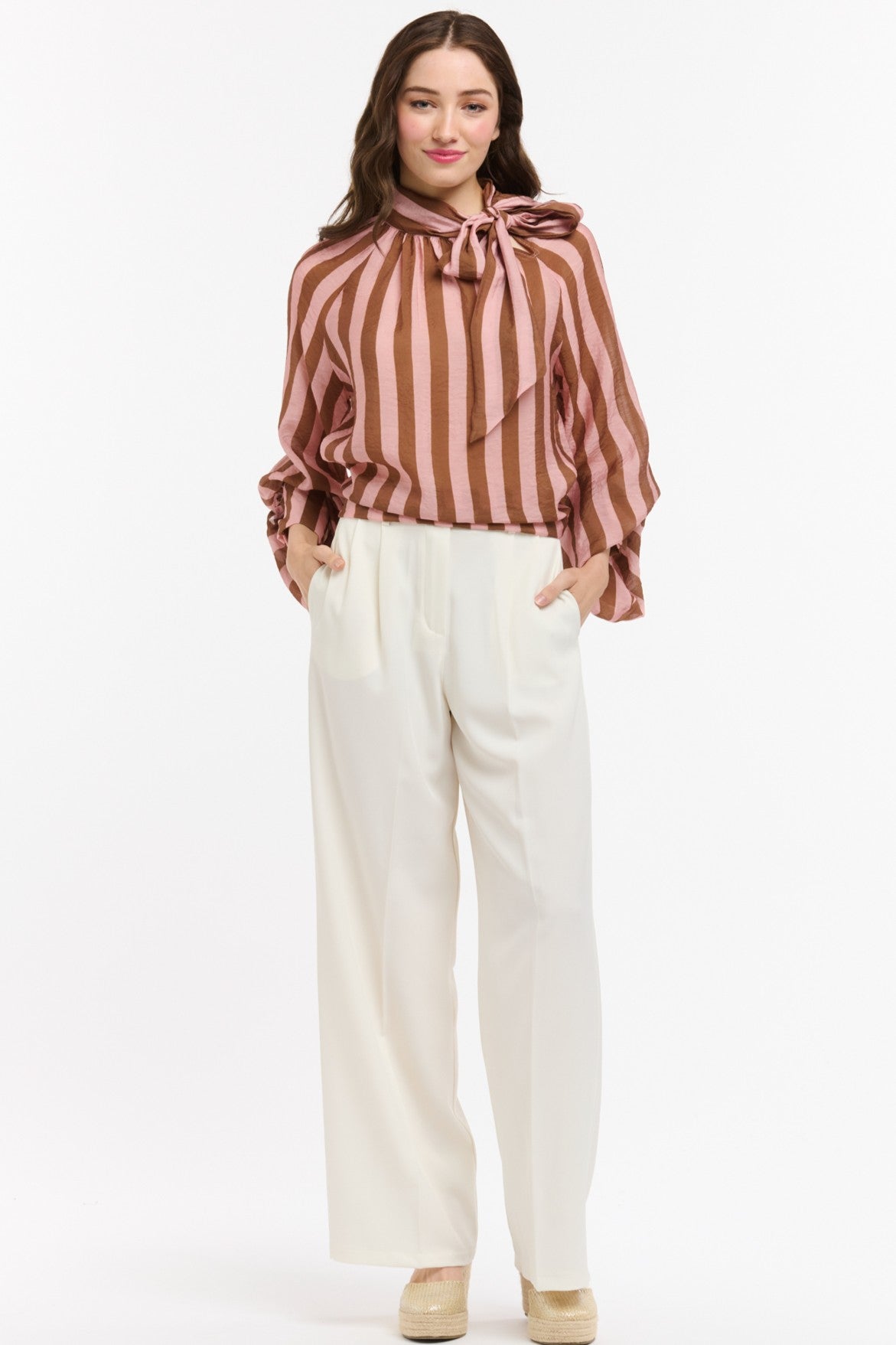 Bold yet beautifully refined, this striped blouse pairs warm brown and soft blush tones in a striking vertical pattern. The statement bow neckline adds a sculptural touch, while the gathered sleeves create volume and movement without overwhelming the silhouette. Cut from a lightweight, fluid fabric, it drapes with ease and brings a fresh, modern twist to classic shirting.